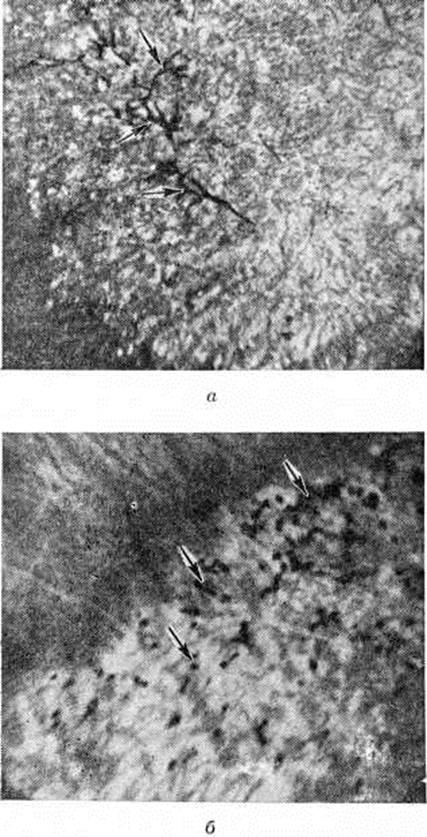 При офтальмоскопии (смотри полный свод знаний) на глазном дне обычно обнаруживают пигментные отложения в сетчатке, восковидную атрофию диска зрительного нерва (смотри полный свод знаний), сужение артериол сетчатки. Пигментные отложения располагаются, как правило, на периферии сетчатки, часто вокруг вен, и обычно имеют вид типичных пигментных очагов, напоминающих по форме остеоциты, или так называемый костные тельца (рисунок 2, а). Пигментные отложения могут иметь также форму глыбок, мозаики, пятен (рисунок 2, б). В редких случаях пигментные отложения в сетчатке могут отсутствовать (пигментный ретинит без пигмента). При центральной форме пигментной дистрофии они располагаются преимущественно в центральном отделе сетчатки, при секторальной форме отмечается секторообразное расположение пигмента на глазном дне. В поздней стадии заболевания выявляются зоны атрофии хориокапиллярного слоя собственно сосудистой оболочки глазного яблока. В ряде случаев пигментная дистрофия сетчатки сопровождается развитием осложненной задней кортикальной катаракты, глаукомы с открытым углом передней камеры (радужно-роговичный угол), миопии. Для диагностики пигментной дистрофии производят электроретинографию (смотри полный свод знаний). На электроретинограмме (ЭРГ) в большинстве случаев отмечается выраженное снижение амплитуды волн.