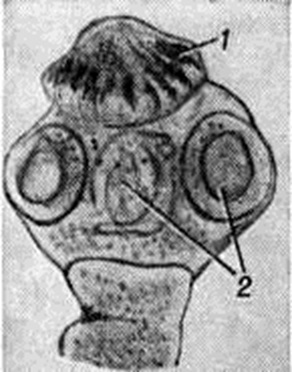 Возбудитель — свиной, или вооруженный, цепень, Taenia solium Linnaeus, 1758; ленточный червь (смотри полный свод знаний: Плоские черви). Достигает во взрослом состоянии 2—3 метров. Головка (сколекс) гельминта имеет до 2 миллиметров в диаметре, снабжена двумя рядами крючьев (отсюда название вооруженный цепень) и четырьмя мышечными присосками (рисунок 1); после тонкой шейки (зона роста цепня) тянется многочленистая (до 1000 члеников) стробила, переднюю часть которой представляют молодые широкие бесполые членики, а среднюю и заднюю — зрелые гермафродитные членики прямоугольной формы размером 10—12 × 5—6 миллиметров. В каждом зрелом членике имеется 7—12 ответвлений матки (рисунок 2), в которых содержится до 50 тысяч покрытых оболочкой яиц с зародышем (онкосферой).окружающую среду яйца попадают при разрушении отошедших от тела гельминта члеников, которые пассивно выделяются больными при дефекации.