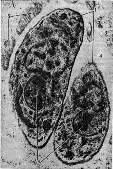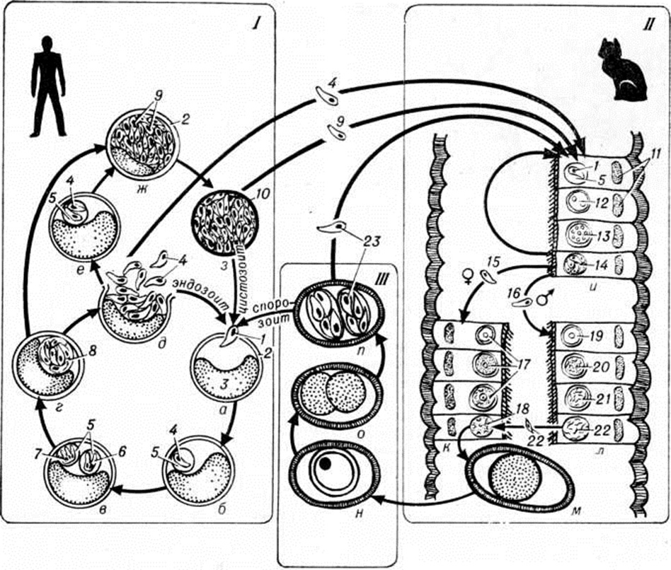 Окончательные хозяева (кошки) могут также заражаться токсоплазмами, находящимися на разных стадиях развития,— спорозоитами, цистозоитами, эндозоитами (рисунок 1, 17), что определяет продолжительность периода от момента заражения до начала выделения ооцист в окружающую среду: при заражении спорозоитами — 20 дней и более, цистозоитами — 3—10 дней, эндозоитами — 19 дней. Развитие токсоплазм в клетках эпителия слизистой оболочки кишечника кошки начинается с процесса шизогонии (рисунок 1, 17, г). При этом образуется несколько морфологически различных типов мерозоитов, одни из которых являются так называемый предшественниками следующих за ними половых стадий женских (рисунок 1, II, 15) и мужских (рисунок 1, II, 16) гаметоцитов. Половое развитие токсоплазм в организме кошки начинается с образования макрогаметоцитов (рисунок 1, II, к, 17) и микрогаметоцитов (рисунок 1, II, л, 19—21). Их развитие приводит к формированию макрогамет (рисунок 1, II, к, 18) и микрогамет (рисунок 1, II, 22). Микрогаметы проникают в зрелую макрогамету и в результате оплодотворения формируется ооциста (рисунок 1, II, м). Ооциста разрушает эпителиальную клетку кишечника окончательного хозяина (кошки) и выходит в его просвет, а затем с фекалиями — в окружающую среду (рисунок 1, III, н) (в почву, в воду, на растения), попадает на предметы обихода, руки. При благоприятных условиях аэрации и температурного режима в течение 2—5 дней происходит созревание ооцисты и образование внутри неё двух спороцист (рисунок 1, III, о), а затем в каждой спороцисте — четырех спорозоитов (рисунок 1, III, п). Спорозоиты размером 1,5 × 7 микрометров развиваются внутри ооцист, имеющих округло-овальную форму и диаметр от 9 до 14 микрометров. Ооцисты, как и заключенные в них спороцисты, окружены плотной бесцветной двухслойной оболочкой. Приобретенный токсоплазмоз — наиболее распространенное из всех зоонозов заболевание. Его возбудитель или специфические токсоплазменные антитела в сыворотке крови обнаружены у представителей всех отрядов диких позвоночных и всех видов домашних животных. Токсоплазменная инвазия у людей встречается повсеместно, на всех континентах pi во всех климатогеографических зонах. Распространенность Токсоплазмоз, как правило, выше на территориях с жарким и влажным климатом, а также среди сельского населения. В странах Центральной Африки и Южной Америки заражённость населения Токсоплазмоз достигает 60—90%, в странах Западной Европы и Северной Америки — 25—50%, в Южной и Юго-Восточной Азии — 5—25%. Ввиду того, что приобретенный Токсоплазмоз в подавляющем большинстве случаев протекает как бессимптомное носительство или субклинически, диагностика его затруднительна и систематического учета заболеваемости Токсоплазмоз не существует. Считается, что токсоплазмами инвазировано около ¼—1/3 населения мира. В СССР заболевание также выявлено, в том числе в районах Крайнего Севера. Распространение его среди людей очень неравномерно, что определяется сочетанием природных и хозяйственно-бытовых условий жизни. Наибольшее влияние на распространение Токсоплазмоз среди людей оказывают численность в населенных пунктах кошек, обычай потребления в пищу недостаточно термически обработанного мяса, уровень санитарный культуры населения. Эпидемиология. Существуют природные и синантропные очаги приобретённого Токсоп