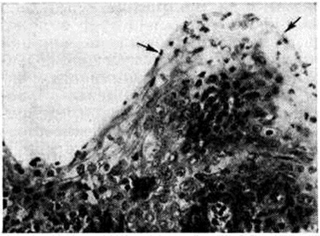 По данным Г. Б. Горбуновой (1977), гистаминопексический индекс сыворотки у большинства больных хроническим Тонзиллит не превышает 5% по сравнению с 30—40% в норме. Особенно угнетена гистаминопексия у больных в возрасте от 12 до 16 лет. Патологическая анатомия. Морфологически изменения в небных миндалинах при хронический Тонзиллит отличаются большим разнообразием. Наблюдаются десквамации или ороговение эпителия, выраженная инфильтрация его лимфоцитами и полиморфно-ядерными лейкоцитами, которые мигрируют в лакуны (миндаликовые крипты), где образуются плотные пробки (рисунок 1). При этом формируются папиллярные выросты эпителия лакун (рисунок 2), которые способствуют задержке в них патологический содержимого. В подэпителиальном слое отмечается разрастание соединительной ткани. В паренхиме небной миндалины выявляются очаги размягчения лимфоидной ткани (хронический паренхиматозный Тонзиллит) либо массивные разрастания соединительной ткани (хронический паренхиматозный склеротический Тонзиллит). Наряду с инволюцией лимфатических, фолликулов отмечается их гиперплазия с многочисленными митозами в светлых центрах. В псевдокапсуле (миндаликовая капсула) и паратонзиллярной клетчатке чаще всего встречаются склеротические изменения. Отмечается периваскулярный склероз — мелкие и средние артерии окружены муфтообразными разрастаниями соединительной ткани, бедной клеточными элементами. Лимф, сосуды и капилляры деформированы pi частично облитерированы. Признаки постепенного запустевания обнаруживаются и в венах, при этом ретикулярная ткань вокруг них подвергается гиалинозу (смотри полный свод знаний). Периваскулярная инфильтрация сопровождается в одних сосудах запустеванием просвета, в других — ослаблением мышечного тонуса и повышением проницаемости стенок, что приводит к снижению скорости кровотока и способствует застойным явлениям. Нарушение лимфооттока из миндалин ведёт к застойным и воспалительным изменениям в регионарных лимфатических, узлах.