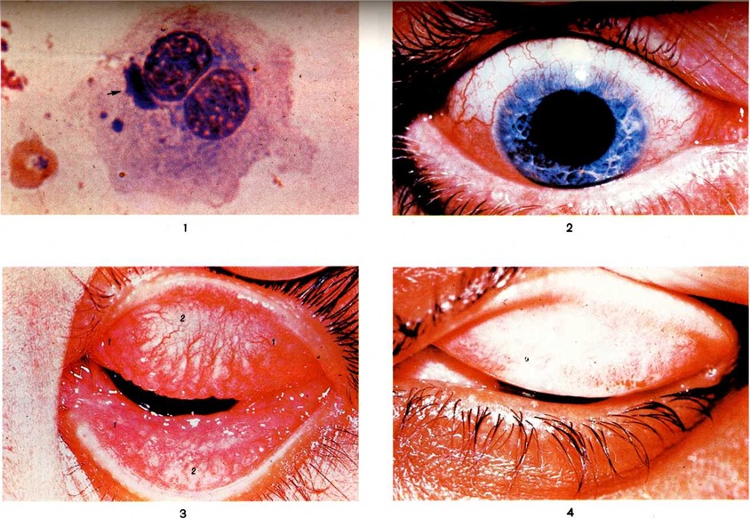 Для Трахома характерно одновременное наличие признаков воспаления, пролиферации соединительной ткани и эпителия, явлений дистрофии. В начальном периоде Трахома в конъюнктиве определяется диффузная инфильтрация нейтрофильными лейкоцитами и гистиоцитами. Начиная с 10—12-го дня заболевания развивается лимфоцитарная и плазмоклеточная инфильтрация. В последующем появляется большое количество юных недифференцированных клеточных форм с наличием многочисленных фигур митозов; в тяжёлых случаях — большое число лимфобластов, плазматических клеток и базофилов. Кроме диффузной инфильтрации, для Трахома характерно образование фолликулов, которые вначале представляют собой очаговые скопления лимфоцитов (незрелые фолликулы). В зрелом фолликуле различают периферическую зону, состоящую из лимфоцитов, и более светлую центральную зону (центр размножения), в состав которой входят эпителиоидные клетки, лимфобласты, гистиоциты, фагоциты. Трахоматозный процесс отмечается рано наступающими дистрофическими изменениями и некрозом ткани конъюнктивы, прежде всего в области фолликулов. Строма фолликулов подвергается склерозу и гиалинозу, но возможна их резорбция без образования рубца. Вокруг фолликулов развивается волокнистая ткань, формирующая капсулу, в которой могут многие годы оставаться замурованными клеточные инфильтраты и возбудитель инфекции. У больных с тяжёлым течением заболевания преобладают диффузно-инфильтративные процессы в конъюнктиве и отёк, отмечается утолщение конъюнктивы с увеличением размеров фолликулов и их заметным выстоянием — папиллярная форма трахомы. В роговице отмечается диффузное воспаление различной интенсивности с проникновением новообразованных сосудов и инфильтрации в область верхней части лимба (цветной рисунок 2) и образованием трахоматозного паннуса (смотри полный свод знаний). В тяжёлых случаях в строме (собственном веществе) роговицы (смотри полный свод знаний) появляются фолликулы (истинная Трахома роговицы). В слезных органах (смотри полный свод знаний) наблюдается воспаление с лимфоидно-плазмоклеточной инфильтрацией и рубцеванием. В тяжёлых случаях инфильтрация распространяется в глубокие слои хряща век. В мейбомиевых железах наблюдается развитие кист, вакуолизация, жировая дистрофия, гиалиноз, амилоидоз хряща. Клиническая картина. Инкубационный период — 7—14 дней. Поражаются обычно оба глаза. Начало заболевания может быть незаметным, без субъективных ощущений. Иногда появляется незначительное слизисто-гнойное отделяемое, ощущение инородного тела и чувство жжения в глазах. Возможно и острое начало болезни. При этом наблюдаются симптомы острого конъюнктивита (смотри полный свод знаний), напоминающего конъюнктивит с включениями; отмечаются гиперемия кожи век, светобоязнь, обильное слизисто-гнойное отделяемое; конъюнктива отечна, гиперемирована. Примерно в 25% случаев встречаются стёртые формы, при которых симптоматика скудная, и заболевание часто диагностируют как хронический конъюнктивит. В клинические, картине Трахома, согласно классификации В. В. Чирковского (1935) и Мак-Каллена (A. F. Mac Callan, 1936), выделяют четыре стадии. I стадия (начальная Трахома) — развитие воспалительных явлений в конъюнктиве, появление незрелых и единичных зрелых фолликулов (трахоматозных зерен) на верх