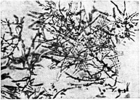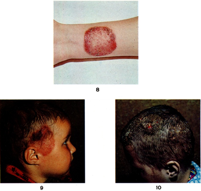 При отсутствии лечения у девочек (у мальчиков заболевание спонтанно проходит) в пубертатном периоде в большинстве случаев заболевание переходит в хронический форму, которая клинически характеризуется наличием на голове небольших участков с коротко обломанными волосами в виде черных точек, часто в сочетании с атрофическими плешинками; на гладкой коже очаги поражения имеют расплывчатые очертания, синюшный цвет и незначительно шелушатся. Они чаще располагаются на коже ягодиц, в области коленных суставов, реже на предплечьях, туловище и лице. Высыпания довольно часто сопровождаются зудом. Почти у 1/3 больных в процесс вовлекаются ногтевые пластинки. Они тускнеют, приобретают грязно-серый цвет, легко крошатся, поверхность их становится бугристой с участками углублений, в ряде случаев возможен онихолизис (смотри полный свод знаний: Ногти). Течение процесса длительное — годы и десятилетия. Редко встречающейся формой хронический Трихофития является хронический генерализованная(гранулематозная) Трихофития, возбудителями которой обычно являются Трихофития violaceum или Трихофития tonsurans. Болезнь начинается с симптомов, свойственных хронической Трихофития Позже на коже появляются трихофитийные гуммы — фурункулоподобные образования (гранулемы), в которых обнаруживаются элементы грибка. Нередко поражается опорно-двигательный аппарат, в том числе голеностопный сустав; при этом болезнь протекает как мицетома (смотри полный свод знаний: Мадурская стопа). С течением времени процесс принимает септико-пиемический характер и может закончиться летально. Диагноз антропонозной Трихофития устанавливают на основании анамнеза (контакт с больными людьми), клинические, данных, подтвержденных лабораторный исследованием (обнаружение спор грибка снаружи волоса, в чешуйках кожи — мицелия грибка). Микропрепараты окрашивают по методу Хочкисса — Мак-Мануса (смотри полный свод знаний: Шабадаша способы); при этом грибки окрашиваются в красный цвет. Дифференциальную диагностику поверхностной Трихофития волосистой части головы проводят с микроспорией (смотри полный свод знаний) и фавусом (смотри полный свод знаний), а также с себорейной экземой (смотри полный свод знаний). При локализации очагов хронический Трихофития на гладкой коже их необходимо дифференцировать с рубромикозом (смотри полный свод знаний: Руброфития), лихеноидным парапсориазом (смотри полный свод знаний) и другими эритемато-сквамозными дерматозами. Лечение проводят гризеофульвином, если нет противопоказаний к его применению; желательно в стационаре. Препарат назначают из расчёта 15—16 миллиграмм/килограмм в сутки ежедневно до первого отрицательного анализа волос или чешуек на грибки (обычно на 15—25-й день от начала лечения). Затем гризеофульвин принимают через день в той же суточной дозе в течение 2 недель и далее 1 раз в 3 дня также в течение 2 недель Одновременно с приёмом гризеофульвина проводят местную терапию — обработку очагов 2—5% спиртовым раствором йода утром и серно-салициловой мазью (3% салициловой кислоты и 10% осажденной серы) вечером. Используют также микозолон. Прогноз неблагоприятный при хронической генерализованной (гранулематозной) Трихофития; при хронический форме Трихофития возможны рецидивы. Профилактика сводится к выявлению источника заражения — лиц