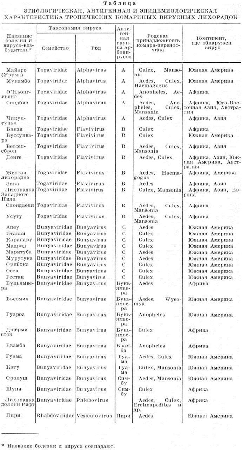 Прогноз при Тропические комариные вирусные лихорадки обычно благоприятный, однако при некоторых из них возможны летальные исходы, например, при желтой лихорадке, лихорадках Западного Нила и долины Рифт. В качестве средства профилактики рекомендуется индивидуальная защита от нападения комаров в очагах Тропические комариные вирусные лихорадки (смотри полный свод знаний: Защитные сетки, Репелленты). Для отдельных Тропические комариные вирусные лихорадки (желтая лихорадка, лихорадка долины Рифт) разработана специфическая профилактика (вакцины). Характеристика наиболее распространенных тропических комариных вирусных лихорадок. Лихорадка долины Рифт. Большие эпизоотии болезни среди крупного рогатого скота, овец, коз, верблюдов регистрируются периодически, с интервалом в 5—15 лет, в Южной и Восточной Африке (Кении, Уганде, Танзании, Южно Африканской Республике). Заболевания среди людей (иногда весьма многочисленные — до 20 тысяч случаев) возникают на фоне эпизоотий. В межэпизоотические периоды отмечаются единичные заболевания среди лиц, контактирующих со скотом. В конце 70-х годы случаи этой лихорадки были зарегистрированы и в северных районах Африки; так, в Египте во время крупной эпизоотии 1977 год заболело более 18 тысяч человек (598 — с летальным исходом). Источником возбудителей инфекции являются больные животные (крупный и мелкий рогатый скот, верблюды). Переносчиками вируса служат комары родов Aedes и Eretmapodites. Возможно, что комары могут передавать вирус трансовариально, являясь его резервуаром и поддерживая энзоотичность инфекции. В период эпизоотий вирус выделяют также от комаров родов Anopheles, Mansonia, Culex. Заражение людей лихорадкой долины Рифт происходит также при контакте с павшими позвоночными животными, при забое скота и разделке туш. Случаев передачи возбудителя от человека человеку не установлено. Инкубационный период 3—4, реже 5—7 дней. Болезнь начинается с резкого подъёма температуры, сопровождающегося ознобом, головной болью, рвотой и диареей, сильными болями в мышцах, суставах, в области живота. Характерны светобоязнь, гиперемия конъюнктивы и лица. В большинстве случаев болезнь длится несколько дней, однако период выздоровления может быть затяжным. В части случаев признаки заболевания исчезают через 24—36 часов, а после короткой ремиссии возникает вторая волна болезни с аналогичными симптомами. Заболевание обычно сопровождается выраженной лейкопенией. Иногда вследствие поражения печени развивается желтуха. У некоторых больных наблюдается геморрагический синдром — пурпура, носовые кровотечения, кровавая рвота, кишечные кровотечения, что нередко заканчивается летальным исходом. Независимо от характера течения болезнь часто сопровождается односторонним или двусторонним поражением глаз (геморрагии сетчатки, ириты и папиллиты), что обычно наблюдается в конце лихорадочного периода или после исчезновения признаков лихорадки (через 1—3 недель). Поражение глаз часто сопровождается односторонней (реже двусторонней) утратой зрения, обычно преходящей, но иногда необратимой. Диагностика в период вспышек основывается на типичных клинические, признаках (острое начало и двухволновое течение, поражение глаз, геморрагические явления, лейкопения). В пользу диагноза говорит наличие случаев заболевания среди домашни