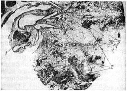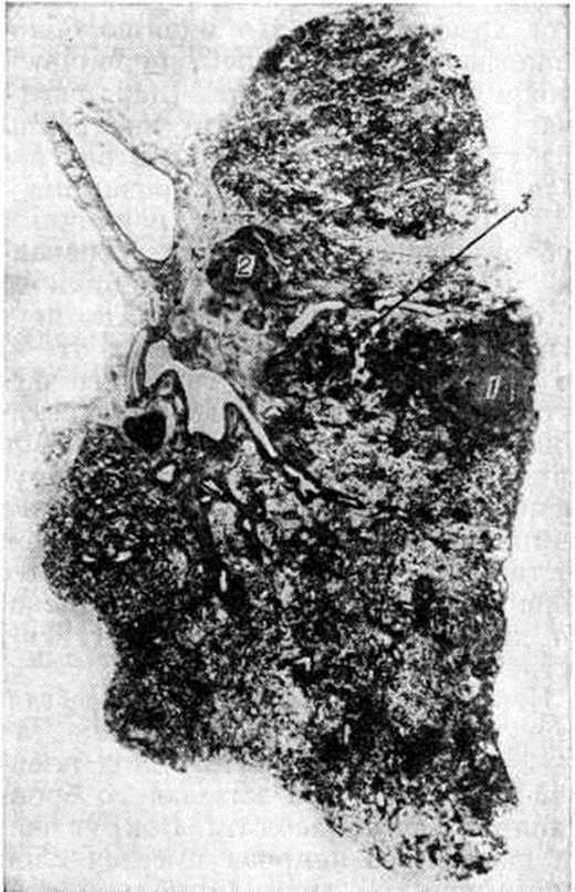 Развитие заболевания у детей связано с первичным инфицированием, чаще аэрогенным путём, а также в результате проникновения микобактерий туберкулёза через нёбные миндалины и слизистую оболочку полости рта. У взрослых заболевание чаще развивается вследствие реактивации ранее перенесённого процесса во внутригрудных лимфатических, узлах. В этом случае бронхаденит (смотри полный свод знаний) осложняется развитием бронхожелезистого свища и распространением процесса на лёгочную ткань. Эта форма известна как железисто-бронхогенная, железисто-бронхолёгочная форма туберкулёза или аденогенный, бронхолёгочный туберкулёз. Поражаются преимущественно бронхолёгочные лимфатических, узлы средней доли правого лёгкого, язычкового сегмента и верхних долей лёгких. При этом в лимфатических, узлах формируются очаги казеозного некроза, занимающие иногда всю ткань лимфатических, узла (рисунок 3). При прогрессировании процесса специфические изменения переходят на окружающие ткани, вовлекая в процесс стенку бронха, нередко с образованием свища. Процессы заживления протекают с частичным рассасыванием и рубцеванием туберкулёзных очагов. Клинические, картина туберкулёза внутригрудных лимфатических, узлов многообразна и зависит от генеза заболевания, выраженности морфологический изменений и их локализации. Развитие бронхаденита, как правило, сопровождается повышением чувствительности к туберкулину (смотри полный свод знаний), нередко развитием узловатой эритемы (смотри полный свод знаний: Эритема узловатая), фликтенулёзного кератоконъюнктивита (смотри полный свод знаний: Конъюнктивит), скрофулодермы (смотри полный свод знаний: Туберкулёз внелёгочный, туберкулёз кожи и подкожной клетчатки), экссудативного плеврита (смотри полный свод знаний). Отмечается повышение температуры тела, недомогание, появление ночных потов, ухудшение аппетита, потеря в весе, сухой кашель. Малая форма бронхаденита, как правило, протекает скрыто, иногда с подъёмом температуры, лёгким недомоганием, что требует особенно тщательного обследования. В зависимости от реактивности организма больного (смотри полный свод знаний: Реактивность организма) и его иммунологический статуса течение туберкулёза внутренних лимфатических, узлов может быть различным. При благоприятном течении вслед за острой вспышкой наступает снижение температуры до субфебрильных цифр и уменьшаются явления интоксикации. Одновременно происходит рассасывание воспаления вокруг увеличенных лимфатических, узлов и уменьшение их размеров. Повышенная чувствительность к туберкулину может сохраняться в течение нескольких лет. Динамика рентгенологическое изменений длительна, уменьшение размеров лимфатических, узлов сопровождается отложением в них (преимущественно в их периферических отделах) крошковидных, а затем более крупных кальцинированных включений. Осложнённое течение туберкулёза внутригрудных лимфатических, узлов отличается большей длительностью и менее благоприятным исходом. Несмотря на рассасывание перифокального воспаления вокруг лимфатических, узлов, процесс в них не затихает, и микобактерии туберкулёза контактным или лимфогенным путём распространяются на другие группы лимфатических, узлов и на другие органы. Наиболее частым осложнением туберкулёзного бронхаден