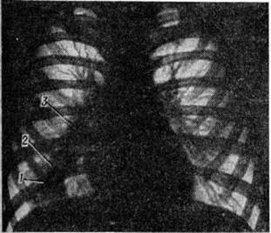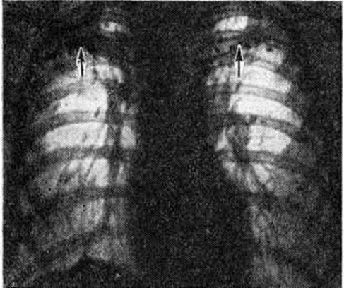 Л. К. Богуш с соавторами (1967) различают концентрический рубцовый стеноз (рисунок 16), пристеночный стеноз с поражением одной стенки бронха и стеноз бронха вследствие полной атрофии стенок (так называемый атрофичный бронх). Иногда, при реактивации туберкулёза внутригрудных лимфатических, узлов, в просвете крупного (главного или долевого) и более мелкого (сегментарного или субсегментарного) бронха образуется бронхолит, представляющий собой секвестр кальцинированной части лимфатических, узла или кальцинированные казеозные массы, проникшие в бронх через бронхиальный свищ. Различают эндобронхиальный бронхолит, при котором кальцинат находится полностью в просвете бронха, трансмуральный бронхолит, характеризующийся частичным выходом кальцината в просвет бронха, и интрамуральный бронхолит, при котором кальцинат находится в толще стенки бронха. Клинические, картина при образовании бронхолита характеризуется разнообразной симптоматикой и может напоминать бронхит, пневмонию, опухоль и другие (смотри полный свод знаний: Бронхолитиаз). Диагноз туберкулёза трахеи и бронхов устанавливают при бронхоскопии (смотри полный свод знаний) с биопсией и бактериологические исследованием полученного материала. При рентгенологическое исследовании следует учитывать прямые и косвенные признаки поражения. Прямыми признаками поражения трахеи, главных и долевых бронхов являются их деформация и сужение вплоть до полного закрытия просветов, локальные утолщения стенок; в области прилегания к стенке бронхов уплотнённых лимфатических, узлов, иногда с кальцинатами, отмечается выбухание стенок бронхов. К косвенным признакам относятся различные вентиляционные нарушения: ателектаз, гиповентиляция, различные по объёму участки эмфиземы. Дифференциальный диагноз проводят прежде всего с острым и хронический неспецифическим эндобронхитом. Основным критерием при этом служит распространённость поражения слизистой оболочки: ограниченное— при туберкулёзе и диффузное, двустороннее,— при неспецифическом процессе. Туберкулёз бронхов дифференцируют с доброкачественными опухолями (смотри полный свод знаний: Бронхи), бронхогенным раком, исходящим из эпителия крупных бронхов в начальной стадии его развития, с саркоидозом (смотри полный свод знаний) органов дыхания, который, по данным ряда исследователей, в 12% случаев сопровождается появлением в слизистой оболочке крупных бронхов пролиферативных изменений в виде бляшек и бугорков, сходных с туберкулёзными, а в ряде случаев — с лимфогранулематозом (смотри полный свод знаний), сифилисом (смотри полный свод знаний), ксантоматозом (смотри полный свод знаний). Лечение туберкулёза трахеи и бронхов комплексное с учётом переносимости больным лекарственных препаратов, а также устойчивости к ним микобактерий туберкулёза. Специфическое поражение трахеи и бронхов свидетельствует об осложнённом течении лёгочного процесса. Поэтому возникает необходимость усиления терапевтического воздействия на организм в целом. При этом сроки лечения удлиняются в зависимости от формы основного процесса. Используют комбинации различных противотуберкулёзных средств (не менее 3—4) в сочетании с патогенетическими. Один из препаратов вводят эндобронхиально шприцем или в виде аэрозоля с учётом индивидуальной переносим
