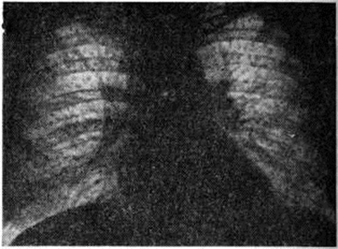 Осложнениями подострого и хронического диссеминированного туберкулёза лёгких являются туберкулёз гортани, кишечника, почек, половых органов (смотри полный свод знаний: Туберкулёз внелёгочный), лёгочные кровотечения, спонтанный пневмоторакс (смотри полный свод знаний), эмпиема плевры (смотри полный свод знаний: Плеврит), дыхательная недостаточность (смотри полный свод знаний) и лёгочное сердце (смотри полный свод знаний), амилоидоз внутренних органов (смотри полный свод знаний: Амилоидоз). Диагноз диссеминированного туберкулёза лёгких ставят на основании бактериологического, иммунологического, бронхологического, а также микроскопического исследования материала, полученного с помощью пункционной биопсии. Однако ведущая роль в распознавании этой формы туберкулёза лёгких принадлежит рентгенологическое методу исследования. На основании рентгенологическое данных выделяют различные типы диссеминированного процесса. Острый диссеминированный туберкулёз характеризуется наличием в лёгких множественных очагов. В зависимости от их размеров выделяют мелкоочаговый (милиарный), среднеочаговый и крупноочаговый типы диссеминации. При мелкоочаговом типе диссеминации размеры очагов не превышают 3 миллиметров в диаметре, очаги имеют однотипный характер, ясные очертания и равномерно рассеяны по обоим лёгочным полям. Очаги образуют комплексные тени с инфильтративно-уплотнённой интерстициальной тканью; структура лёгких при этом приобретает мелкосетчатый, петлистый характер; сосудистый рисунок не прослеживается (рисунок 5). При среднеочаговом типе диссеминации очаги имеют размеры 5 миллиметров в диаметре; они однотипны по форме, размерам, интенсивности, имеют нечёткие очертания и располагаются на фоне сетчато-тяжистых интерстициальных изменений. Крупноочаговый тип диссеминации характеризуется наличием очагов диаметром до 12—15 миллиметров. Очаги имеют неправильно-круглую форму, однородную структуру; некоторые из них чётко очерчены, что свидетельствует об их осумковании; очаги склонны к слиянию и распаду. Помимо сетчатых определяются и тяжистые тени перибронхиальных интерстициальных уплотнений. При всех типах диссеминации отмечается эмфизема, корни лёгких теряют чёткость очертаний, у ряда больных выявляется бронхаденит. Дифференциальный диагноз острого милиарного туберкулёза лёгких, особенно в начале болезни, проводят с брюшным тифом (смотри полный свод знаний). При туберкулёзе температура повышается быстро и на 1—2-й день достигает 39—40°; на 2-й неделе лихорадка становится неправильного типа (смотри полный свод знаний: Лихорадка), пульс учащённым, отмечаются резко выраженная одышка, цианоз, лимфопения без лейкоцитоза, на 7—8-й день болезни выявляются изменения на рентгенограмме. Исследование глазного дна позволяет обнаружить на нем милиарные бугорки. При брюшном тифе температура повышается постепенно и образует типичную кривую, отмечаются относительная брадикардия, дикротия пульса. Одышка не выражена, лейкопения сопровождается лимфоцитозом, появляются тифозные розеолы и другие Отмечается положительная реакция Видаля (смотри полный свод знаний: Видаля реакция) и обнаруживается возбудитель брюшного тифа в крови. Рентгенограмма не изменена. Туберкулинодиагностика и бактериологические исследования мокроты 