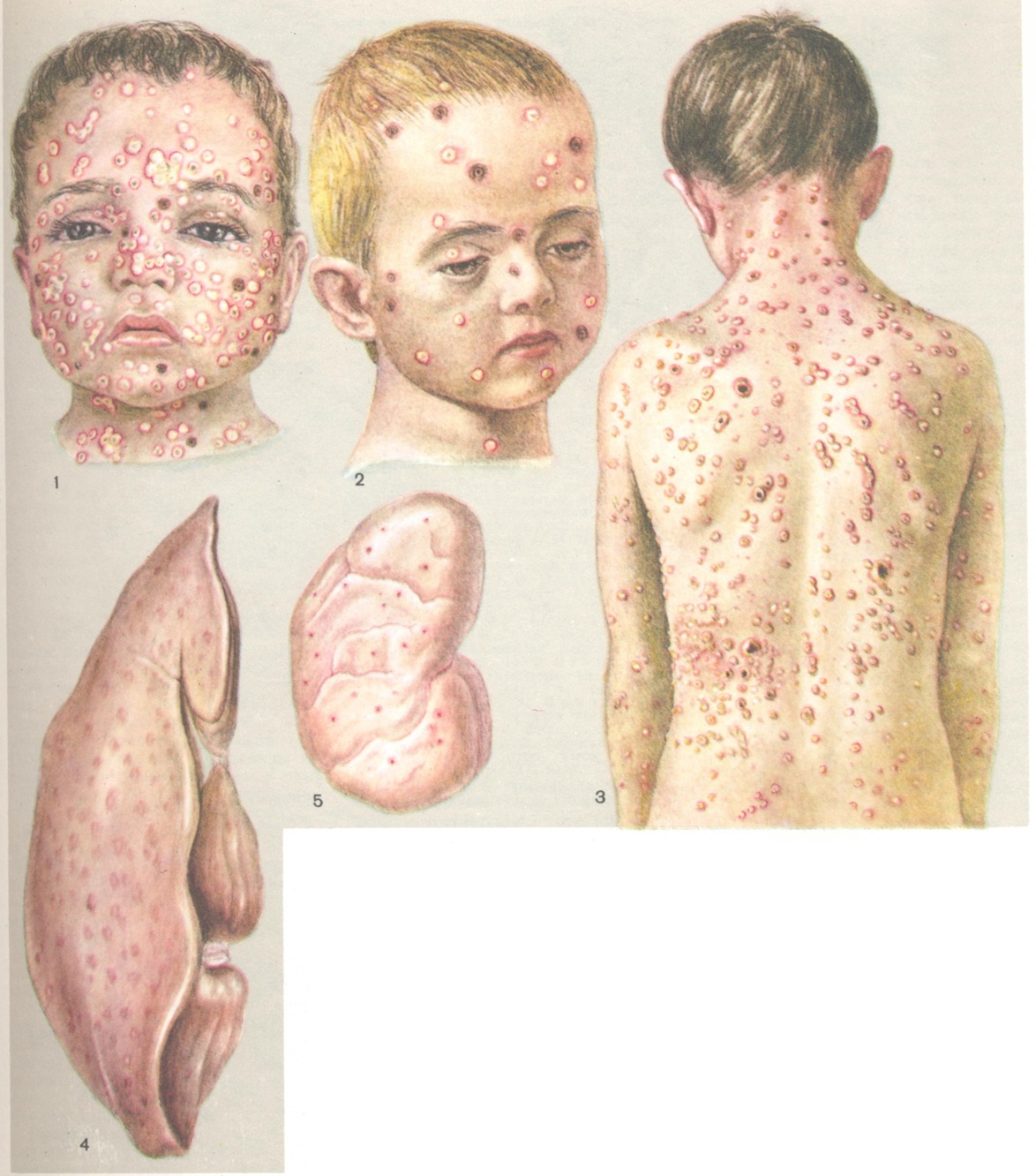 При Ветряная оспа поражаются кожные покровы, слизистые оболочки, внутренние органы и головной мозг. Образование ветряночных пузырьков в коже начинается с вакуолизации и дискомплексации шиповидного слоя эпидермиса. Постепенно эпителиальные клетки подвергаются баллонной дистрофии до полной гибели. Характерным является наличие внутриядерных и внутрицитоплазматических эозинофильных включений в изменённых клетках эпидермиса. В шиловидном слое наблюдается гиперплазия, приводящая к образованию многоядерных синцитиальных клеточных форм. Последнее особенно выражено при формировании крупных пузырьков. Некрозы клеток эпидермиса и накопление межтканевой жидкости ведут к образованию внутриэпидермальных пузырьков. Дерма отёчна, в некоторых случаях в ней наблюдаются кровоизлияния и небольшое увеличение моноцитарных клеток в периваскулярной ткани. Инволюция пузырьков происходит путём резорбции жидкости с образованием сухой корочки. Различные стадии развития и размеры пузырьков обусловливают полиморфизм сыпи, характерный для Ветряная оспа (цветной, рисунок 1—3). При тяжёлой форме Ветряная оспа наблюдается образование очень крупных пузырьков, как бы застывших на одной стадии развития. Образование эрозий и язвочек на видимых слизистых оболочках наблюдается и при Ветряная оспа без летального исхода. В случаях Ветряная оспа с летальным исходом эрозии и язвочки описаны на слизистых оболочках пищеварительного тракта, трахеи, почечных лоханок, мочевого пузыря, уретры, шейки матки. Макроскопически отмечается округлость формы, наличие геморрагического пояса, размеры, соответствующие элементам кожных высыпаний. Микроскопически — значительный отёк подслизистого слоя, кровоизлияния и в неосложнённых случаях отсутствие воспалительной инфильтрации. На конъюнктиве глаза и слизистой оболочке уретры можно наблюдать образование везикул, предшествующих эрозиям, с баллонной дистрофией эпителия. Из внутренних органов чаще поражаются печень, почки, лёгкие; реже — селезёнка, костный мозг, кора надпочечников, поджелудочная железа, тимус.