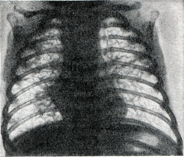 Иногда наблюдается эозинофилия до 15% . Биохимические, бактериологические, вирусологические, серологические данные без особенностей. В течение болезни развивается дыхательный аци¬доз, снижается насыщение кислоро¬дом крови. Приблизительно на 3-й неделе появляются типичные для В.— М. с. изменения на рентгенограммах: базальная и распространённая эмфизема, симметричное усиление лёгочного рисунка в области корней (рисунок), утолщение интерстициальных перегородок, увеличение размеров сердца; типична «нодозно-ретикулярная сетка» — рентгенологическое отображение незрелой лёгочной ткани. Сетка состоит из теней нередуцированной и содержащей эмбриональные волокна соединительной ткани, между которыми расположены заполненные воздухом незрелые концевые отделы дыхательных путей. Сетка включает очаги — тени нерасправившихся постнатально долек лёгких и мелких неразвитых сосудов. Присоединение расплывчатых затемнений указывает на развитие отечно-геморрагического синдрома, который резко ухудшает прогноз заболевания. Постепенное созревание лёгочной ткани, отмечаемое рентгенологически по восстановлению нормальной структуры лёгочного рисунка, ведёт к благоприятному исходу.