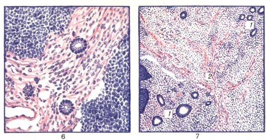 Опухоль имеет вид хорошо отграниченного узла и может достигать больших размеров (рисунок); располагается под капсулой или около ворот почки. Опухоль плотная, на разрезе чаще имеет вид гомогенной ткани, серого или розового цвета, иногда пёстрая. Гистологически (цветной рисунок 6 и 7) выделяют: 1) опухоли с преобладанием нефрогенной ткани, которые могут быть с выраженной дифференцировкой нефрогенного зачатка, со слабо выраженной дифференцировкой нефрогенного зачатка, с недифференцированным нефрогенным зачатком; 2) опухоли с преобладанием мезенхимальной ткани; 3) опухоли с преобладанием нейроэктодермальной ткани. Нефрогенная ткань в Вильмса опухоль напоминает эмбриональный зачаток почки и представлена скоплениями или тяжами мелких клеток с круглыми или овальными ядрами и узким ободком цитоплазмы. Клетки образуют трубочки, подобные почечным канальцам, или структуры, напоминающие почечные клубочки. Мезенхима опухоли состоит из круглых или звездчатых клеток, сходных иногда с фибробластами и свободно лежащих среди переплетающихся фиброзных волокон. Нейрогенная ткань представлена клетками, напоминающими симпатогонии и симпатобласты. Местами эти клетки образуют розетки или располагаются рядами, характерными для симпатобластомы. В Вильмса опухоль нередко встречаются комплексы из мышечных волокон и миобластов. В большинстве случаев опухоль бессосудистая; наиболее часто метастазирует в лёгкие, лимфатических, узлы, реже в печень, редко в другие органы.
