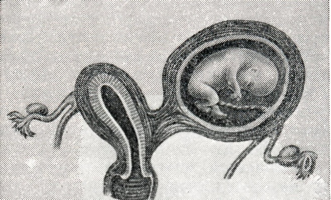 Беременность в рудиментарном роге матки (рисунок 4) протекает по типу эктопической. Рудиментарный рог связан с маткой (нормально развитым рогом) широкой ножкой, которая в 85% случаев не канализирована. Беременность в нем возникает при migratio ovi externa.