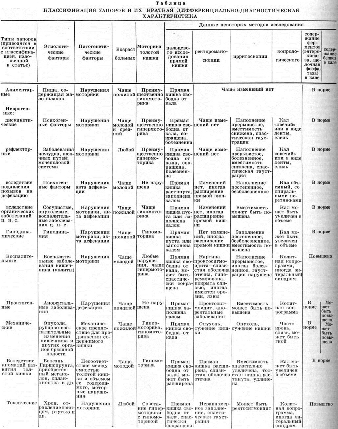 Алиментарные запоры относятся к числу наиболее распространённых. Важное значение для образования испражнений и выделения их из организма имеет состав пищи. Основную массу шлаков в пище человека составляют продукты, богатые грубой клетчаткой, растительными волокнами, способными раздражать рецепторы кишечника и стимулировать его моторику. У людей, длительное время питающихся легко усваивающейся обработанной пищей, могут развиться стойкие Запоры Пища, состоящая преимущественно из белков, мучнистых блюд, легкоусвояемых сахаров, хорошо переваривается пищеварительными соками, образует небольшое количество кала и быстро теряет свои раздражающие свойства. У здоровых людей алиментарный фактор редко может быть единственной причиной Запоры. Чаще отмечается сочетание однообразного питания с малоподвижным образом жизни. Нередко алиментарные Запоры являются следствием длительной щадящей диеты, возникают у лиц с дефектами жевательного аппарата. По мнению ряда авторов, к развитию алиментарных Запоры может привести недостаточное употребление жидкостей, следствием чего является высыхание каловых масс. Неврогенные запоры встречаются часто. Основной патогенетический механизм неврогенных Запоры — нарушение нервной регуляции кишечной моторики. Причиной их могут стать психическое перенапряжение, затянувшаяся психическая депрессия и так далее. В таких случаях может иметь место как снижение перистальтики толстой кишки, так и усиление её; сочетание этих процессов приводит к дискинезии кишечника — дискинетические Запоры В основе их лежит нарушение координации отдельных видов движений толстой кишки с развитием одновременно спазма в одних и атонии в других её участках. Термин «дискинетические запоры» целесообразно использовать только для обозначения Запоры, возникающих в результате расстройства моторной функции кишечника. Запоры вследствие уменьшения двигательной деятельности кишечника называют гипомоторными (гипокинетическими), в результате усиления сокращения стенки кишки — гипермоторными (гиперкинетическими). Гипокинезия кишечника возникает в результате того, что нервные приборы кишечника либо слабо раздражаются, либо частично теряют способность воспринимать раздражение. Недостаточная стимуляция движений может быть следствием нарушения желудочно-кишечные рефлексов, недостаточности периферических рефлексов из-за малого образования каловых масс. Причиной гипокинезии может быть блокада парасимпатической нервной системы или повышение порога раздражимости рецепторов кишечной стенки в результате применения частых и сильных раздражителей (сильнодействующие слабительные, клизмы). Гиперкинезия кишечника характеризуется возникновением спазмов, чаще всего в местах, которые и при нормальных условиях находятся в состоянии усиленного сокращения (переход слепой кишки в восходящую ободочную, сфинктер Пайра, Балли и другие). Причины их крайне разнообразны. Эти Запоры, в частности, являются следствием повышенной раздражительности кишечника под воздействием стимулирующих неврогенных влияний у легковозбудимых лиц. Рефлекторные запоры возникают при заболеваниях различных отделов системы пищеварения (желудка, желчных путей, поджелудочной железы), при патологии мочеполовой системы и другие Рефлекторные вли