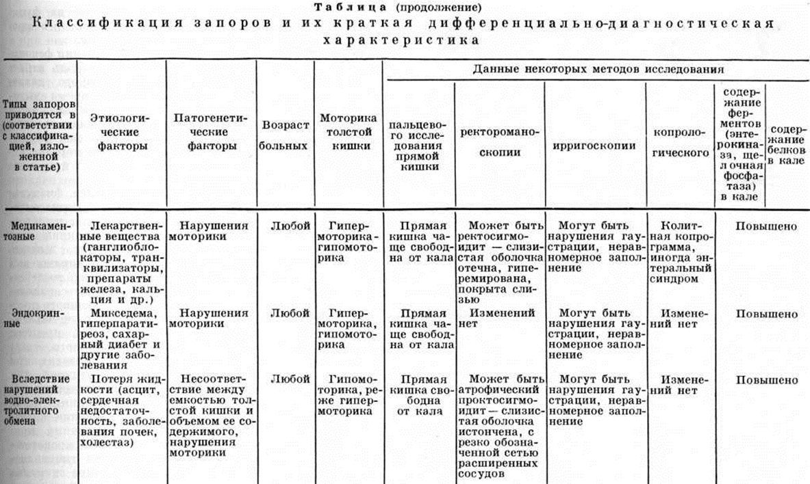 Опорожнение кишки от контрастного вещества при Запоры может происходить в течение 72—96 и более часов (норма 24—36 часов). При Запоры с ограниченным колостазом (сегментарный Запоры) длительная задержка контрастной массы имеет место только в отдельных участках кишки — в слепой и восходящей ободочной (3. восходящего типа, правосторонний), поперечной ободочной (трансверсальный тип Запоры) или в нижней части сигмовидной и прямой кишке (проктогенный Запоры, дисхезия). При этом пассаж бария по остальным отделам кишки остаётся нормальным или, реже, ускоренным. Длительная задержка бария в сигмовидной кишке часто наблюдается при её удлинении. Стаз в слепой и восходящей ободочной кишке может сопровождаться стазом бария в подвздошной кишке и червеобразном отростке. Возможно также сочетание различных видов ограниченных колостазов, например, правостороннего с трансверсальным, трансверсального — с левосторонним. Классификация Запоры и их дифференциально-диагностическая характеристика представлены в таблице. ЛечениеТерапевтическая тактика при Запоры в значительной степени зависит от их типа и прежде всего предусматривает лечение заболевания, симптомом которого может быть Запоры При алиментарных Запоры хорошие результаты достигаются корригирующей диетой. Рекомендуют пищу с большим содержанием клетчатки и достаточным количеством жидкости (1,5—2 литров в сутки), продукты, способствующие опорожнению кишечника (кислое молоко, фруктовые соки, хлеб из муки грубого помола н другие). Полезно употребление размоченных в воде чернослива и инжира, настоя из них, пюре из сухофруктов. При дискинетических Запоры с гипермоторикой прежде всего следует назначать бесшлаковую диету с примесью жиров, постепенно добавляя в пищу клетчатку нежной, а впоследствии более грубой консистенции. Следует избегать продуктов, способствующих усиленному газообразованию (бобовые, молоко и другие). При гипокинетических Запоры назначают растительные жиры, в частности оливковое масло; пищу нужно принимать в достаточном объёме. Несмотря на большую роль диеты в лечении Запоры, она может не дать никакого результата, если у больного не выработана привычка освобождать кишечник в определённое время дня. Особенно важно учитывать это при лечении Запоры, возникших вследствие подавления позывов на дефекацию. Для восстановления этого рефлекса рекомендуется выпивать по утрам натощак стакан холодной воды или фруктового сока, активизирующих перистальтику. Через полчаса после приёма пищи больной должен с помощью определённых приёмов (соответствующая поза, массаж живота, ритмичное втягивание заднего прохода, надавливание на область между копчиком и задним проходом) попытаться вызвать дефекацию. При повторной попытке целесообразно введение в задний проход глицериновой свечи. Очень важно, чтобы врач с психотерапевтической целью подчеркнул абсолютную эффективность этого метода во всех случаях подобного рода Запоры Необходимыми при лечении Запоры являются мероприятия, регулирующие режим труда и отдыха больных, способствующие налаживанию нормального стула. Медикаментозная терапия при Запоры должна проводиться с большой осторожностью, кратковременными курсами, под строгим врачебным контролем. Показанием к применению слабительных средств служат острые Запоры В т