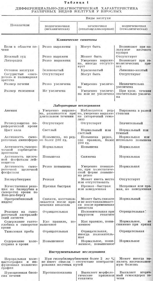 Печёночная желтуха (паренхиматозная)Происхождение этого вида Желтуха связано с инфекционным (вирусный гепатит) и токсическим поражением печени (отравления химический веществами, непереносимость лекарств и так далее). Печёночная Желтуха наблюдается также при циррозах печени, некоторых паразитарных заболеваниях, острых и хронический инфекциях и другие К печёночным Желтуха относят также некоторые особые формы поражения печени, например, холангиолитические (холестатические) гепатиты. Разнообразные расстройства образования и выделения билирубина обусловлены возникновением сообщений между желчными путями, кровеносными и лимф, сосудами, повреждением стенки мелких желчных ходов и образованием тромбов, создающих внутрипечёночные препятствия прохождению желчи, чему способствует также воспалительный отёк перипортальных пространств. При печёночной Желтуха (цветной таблица, ст. 176, рисунок 2) желтушность лимонного или красноватого оттенка; в сыворотке крови повышается содержание связанного билирубина до 20 миллиграмм% и выше. В моче появляется билирубин и желчные кислоты ещё до видимой Желтуха, а затем их количество нарастает. Полное обесцвечивание кала наблюдается редко. С самого начала заболевания, помимо пигментной, нарушаются и другие функции печени. Наиболее типичным клинический, проявлением печёночной Желтуха является Желтуха при болезни Боткина (смотри полный свод знаний Гепатит вирусный). Дифференциальный диагноз при Желтуха любой гепатобилиарной патологии представляет значительные трудности и складывается из следующих основных этапов: 1) установление симптома Желтуха с исключением псевдо-желтухи; 2) определение патогенетического варианта Желтуха (гемолитическая, печёночная, подпечёночная) на основе совокупности данных клинический, и лабораторно-инструментального обследования больного; 3) установление нозологический диагноза с его обоснованием и решением вопроса о консервативном или хирургическом лечении. Практически важно дифференцировать основные патогенетические варианты Желтуха Важнейшие дифференциально-диагностические признаки приведены в таблице 1. ЛечениеС расширением знаний патогенеза различных типов Желтуха стало возможным во многих случаях проводить их этиологического терапию, дополняющую лечебный мероприятия, направленные на ликвидацию заболевания, симптомом которого является Желтуха Больных с Желтуха следует возможно быстрее госпитализировать с целью окончательного выяснения диагноза, создания соответствующего режима и проведения лечения. Назначают постельный режим и, как правило, дробное диетическое питание с ограничением жиров и достаточным количеством углеводов и витаминов. Учитывая склонность к кровотечениям, больным назначают витамин К, викасол, аскорбиновую к-ту, витамины группы В, внутривенное введение хлорида кальция. При тяжёлых формах Желтуха рекомендуется внутривенное введение глюкозы, иногда в сочетании с подкожными инъекциями инсулина. Полезно обильное питье, особенно минеральных вод (боржом, ессентуки № 4, № 17 и другие). Широко применяют желчегонные средства (холосас, дехолин и другие), а при наличии инфекции в желчных путях — антибиотики. В некоторых случаях производят дуоденальное зондирование (смотри полный свод знаний), что способствует отделению же