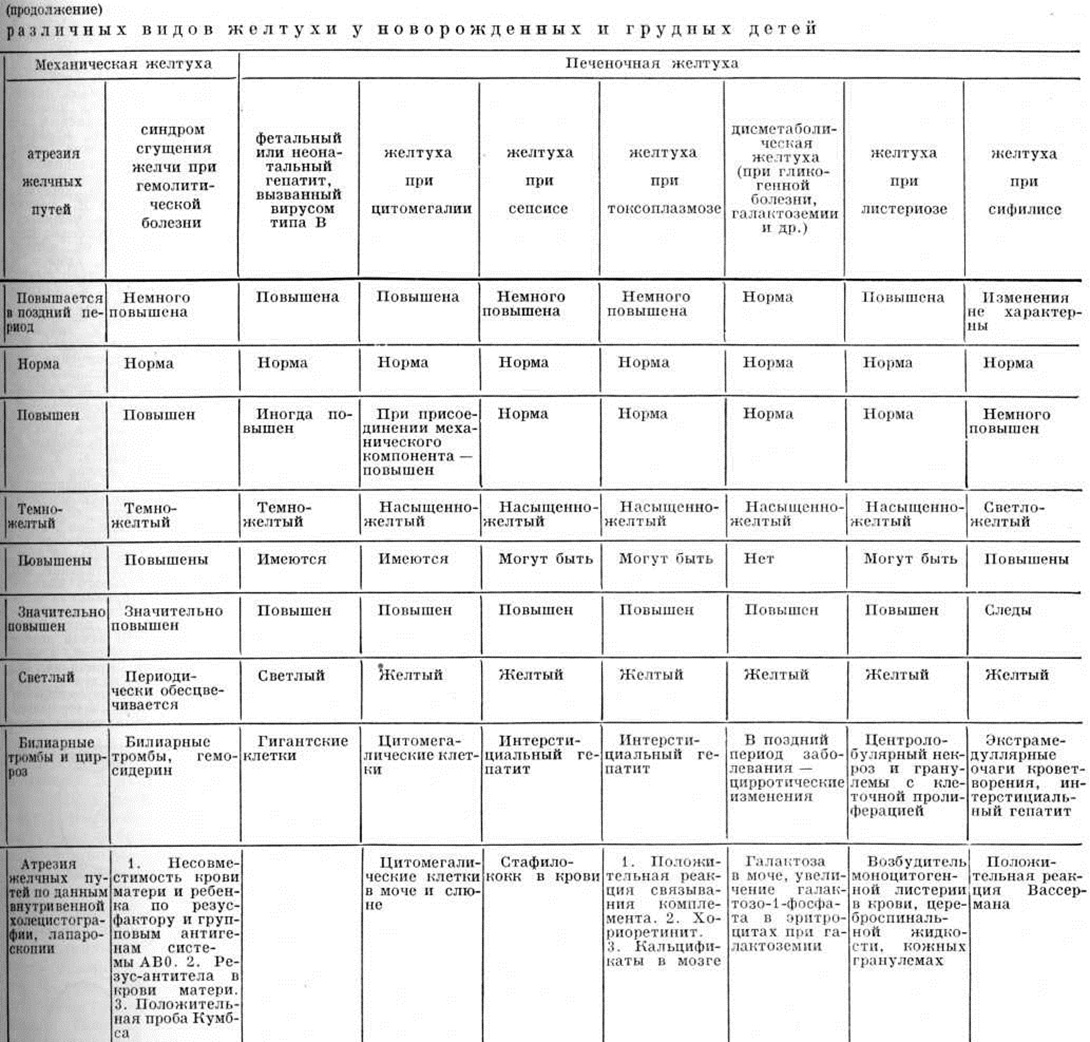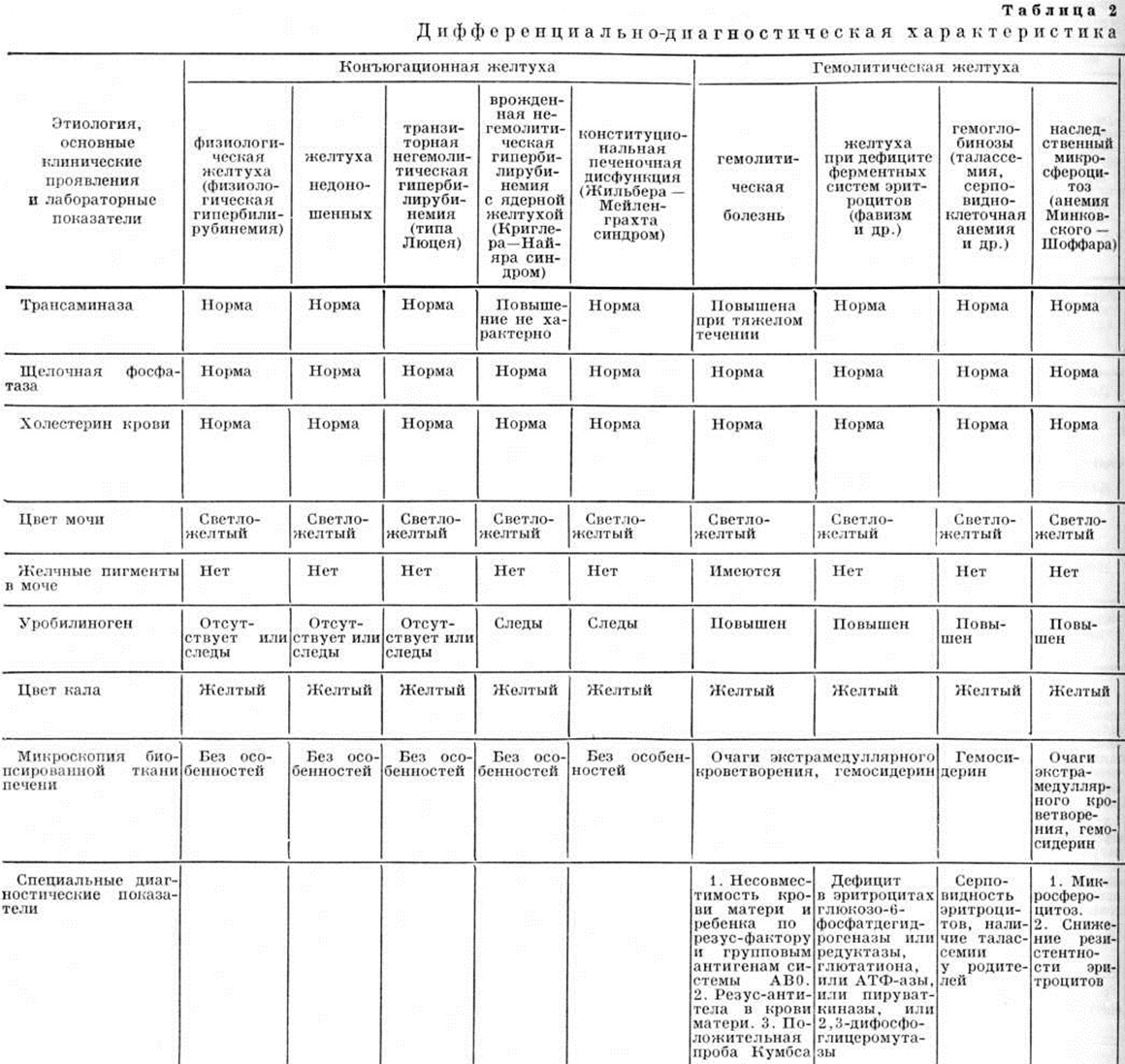 Конституциональная печёночная дисфункция юношеская и взрослых (синдром Жильбера — Мейленграхта) впервые описана Жильбером (N. A. Gilbert) в 1901 год под названием «холемия простая семейная». Причиной Желтуха, по мнению одних авторов, является нарушение захвата билирубина печёночной клеткой; по мнению других — нарушением конъюгации непрямого билирубина с глюкуроновой кислотой, что обусловлено наследственной неполноценностью глюкуронилтрансферазной системы. Наследуется заболевание по аутосомно-доминантному типу. Клинически заболевание характеризуется Желтуха, меняющейся по интенсивности, временами полностью исчезающей. И, связана с накоплением в крови непрямого билирубина, уровень которого в крови колеблется от 5 до 8 миллиграмм%. Начало появления желтухи значительно варьирует, начиная от периода новорожденности и до 10 летнего возраста. Желтуха сопровождается нарушениями со стороны желудочно-кишечные тракта: тошнотой, болезненностью в правой верхней половине живота, чувством полноты в желудке. Появление и усиление Желтуха у детей старшего возраста нередко отмечается после физических перегрузки, эмоционального напряжения, приёма некоторых лекарств (преднизолона, тетрациклинический, сульфаниламидов), при присоединении интеркуррентных заболеваний — ангины, острой респираторной инфекции и другие Признаков усиленного гемолиза при синдроме Жильбера—Мейленграхта не отмечено. Размеры печени и селезёнки в пределах нормы. Окраска кала и мочи нормальная. Лечение: в фазе усиления Желтуха назначают щадящую диету с ограничением жиров. Рекомендуется уменьшение физических нагрузки. Прогноз заболевания благоприятный. Гемолитическая желтуха связана с усиленным гемолизом эритроцитов, наступающим под влиянием антител матери при изоиммунизации, при дефиците или врождённой недостаточной активности глюкозо-6фосфатдегидрогеназы эритроцитов, а также при нарушении структуры эритроцита или структуры гемоглобина. Отмечается накопление в крови свободного билирубина, нормохромная анемия гиперрегенераторного характера, увеличение печени и селезёнки. К этому типу Желтуха относятся: Желтуха при гемолитической болезни новорожденных, связанная с несовместимостью крови матери и плода; Желтуха при дефиците ферментных систем эритроцита; гемоглобинозы. Лечение проводится с учётом этиологического фактора, вызвавшего усиление гемолиза, и направлено на предупреждение резкого накопления непрямого билирубина, который при высокой концентрации может вызвать поражение центральная нервная система с последующим отставанием ребёнка в физических и психическом развитии. Печёночная желтуха, обусловленная поражением паренхимы печени. Причиной поражения являются различные заболевания, вызываемые бактериями, вирусами, простейшими и другие В случаях Желтуха, связанной с гепатитом новорожденных, в крови может повышаться как непрямой, так и прямой билирубин. Если при этом уровень общего билирубина превышает 3—5 миллиграмм%, то независимо от этиологического фактора, явившегося причиной гепатита, устанавливается приблизительно постоянное соотношение между обеими формами билирубина, причём уровень непрямого билирубина иногда может даже несколько преобладать. Поражение паренхимы печени особенно неблагоприятно для новорожденных в связ