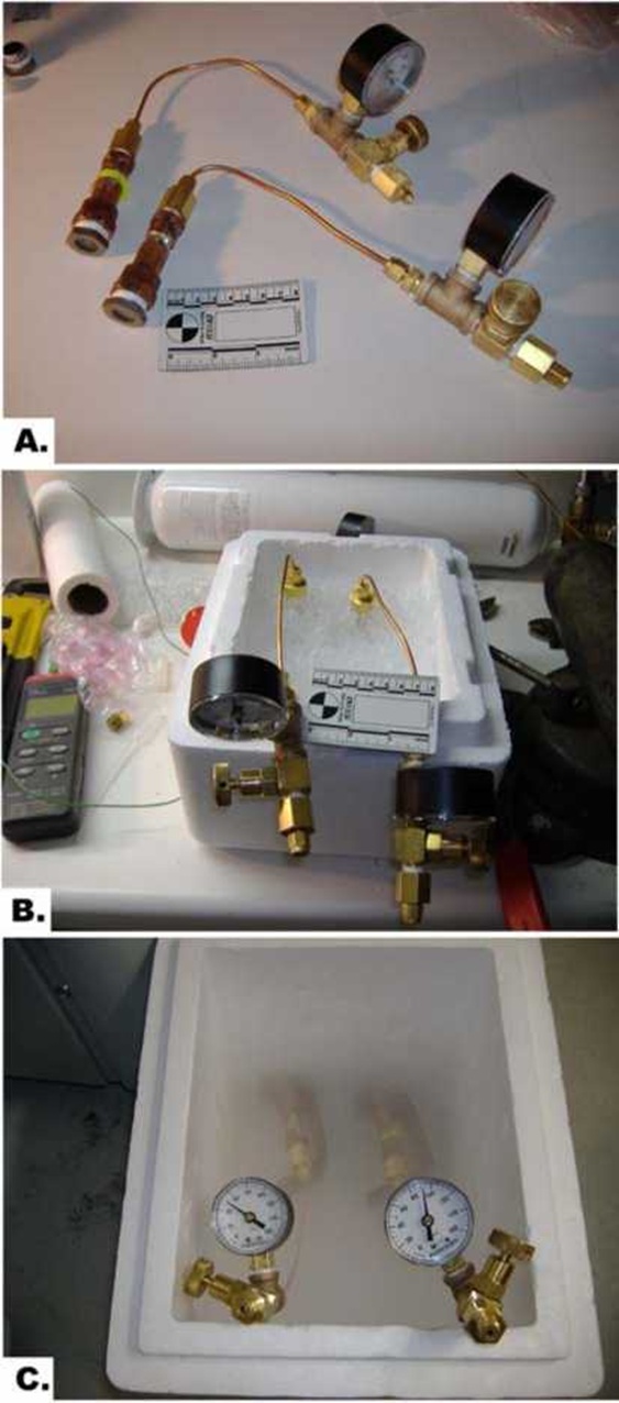 Благородный газ ксенон, который может образовывать клатраты под низким давлением (выше 40 фунтов на квадратный дюйм) может быть альтернативным методом криоконсервации больших биологических объектов, в том числе внутренних органов. Предварительные испытания ксенон-клатратный анабиоз (с использованием газовой смеси ксенона-азот-кислород при температуре от +5° C при высоком давлении) на планарии показал, ксенон клатратообразования в тканях животных и обратимость этой процедуры (неопубликованные данные). Целью настоящего исследования было определить, является ли ксенон-клатратный анабиоза с использованием ксенона под давлением имеет защитное действие на внутриклеточных мембран кардиомиоцитов. Материал и методы. Животные. Эксперименты были проведены на 10 белых мышей (Mus мышцы) (мужчины, 6-8 недель; 25 ± 2 грамм массы тела). Животные были подвергнуты эвтаназии с галотан (Sigma-Aldrich,. Cat B4388) в соответствии с процедурой, рекомендованной Группой об эвтаназии Американской ветеринарной ассоциации. Сердца были немедленно расчлененных и введён в Corning крио-флаконов (без крышки), содержащий 200 JL кислородом изменение Krebs-Henselite решение (118.4 миллилитров NaCl, 25 миллилитров NaHCO3, 4.7миллилитров KCl, 1,6 KH2PO4, 0,6 MgSO4, 2,5 миллилитров CaCl2, 11миллилитров глюкозы) для защиты сердечной ткани от высыхания. Крио-флаконов были помещены внутрь камеры давления (рис. 1А), давление с ксенон-кислородной смеси (ксенон - 90psi, кислород - 10PSI) и оставили на льду в течение 15 минут, как показано на рисунке 1b. Контрольные образцы были под давлением с азотно-кислородной смеси (90psi и 10PSI, соответственно). Тогда давление камеры были помещены на стендах в контейнер из пенопласта над жидким азотом для постепенного охлаждения в течение 15 минут, а затем погружают в жидкий азот в течение ещё 15 минут (рис. 1 С). Барокамеры со всей мышиного сердца нагревают при комнатной температуре в течение 15 минут и открыто. Температура образцов измерялась с помощью Sper Научно 800024 Multi-Input Термопары Термометры (кат. № К-94461-35 от Cole-Parmer Instrument Company, Вернон Хиллс, штат Иллинойс) с гибким Teflon изолированные проволоки термопары. Электронная микроскопия. Сердце образцов тканей (3 × 3 × 3 миллилитров) были вырезаны из вершины и сразу же фиксируется в холодную (+4° C) 2,5% глутарового альдегида в 0,1 М натрий буфере Соренсена (электронная микроскопия наук;. Cat 15980). Сердечных образцы оттаивают при комнатной температуре до 0° C, прежде чем положить их в фиксаторы, чтобы избежать фиксации артефактов. Образцы были получены после фиксированного 1% осмия в том же буфере в течение одного часа при комнатной температуре, а затем три раза промывали тем же буфером и в три раза дистиллированной водой. Образцы были окрашены единым блоком с 0,5% уранилацетата течение двух часов при комнатной температуре, затем трижды промывают дистиллированной водой и постепенно обезвоженных с этанолом до перевода в ацетоне. Эпоксидной смолы Spurr был использован для инфильтрации и блоки полимеризоваться в течение 48 часов при 60° C. Тонкие срезы на Leica R Ultracut микротома и пост-окрашенных уранилацетатом и цитратом свинца. Образцы были обнаружены и зарегистрированы в 80kV ускоряющее напряжение на Philips CM-12 Сканирование просвечивающей электронной микроскопии (Нидерланды) в электронной микроскопии и WM Кек Bioimaging лаборатории Университета штата Аризона. Изображения были записаны на