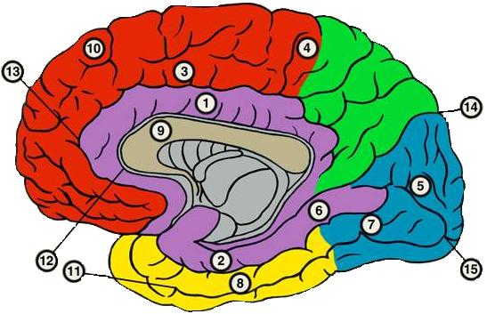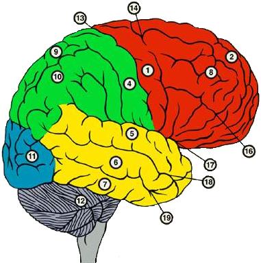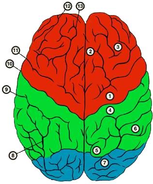 Лобные доли у человека являются структурной основой осуществления высших психических функций, которые проявляются в формировании личностных качеств, творческих процессов и влечений. Построение целенаправленного поведения, основанного на предвидении, резко нарушается при повреждении лобных отделов коры большого мозга (см. рис. №№1, 2, 3). Единство функционирования правого и левого полушарий коры головного мозга обеспечивается отростками нейронов, соединяющих между собой симметричные по функциям участки левого и правого полушарий ( комиссуральными волокнами), входящими в особое анатомическое образование, состоящее только из одних отростков нейронов ( комиссуральных волокон) и называемое мозолистым телом. При его повреждении или перерезке каждое полушарие начинает самостоятельно осуществлять свои специфические функции. У большинства здоровых людей доминирует левое полушарие, обеспечивая восприятие ( интерпретацию) и формирование устной и письменной речи, контроль за действиями правой руки. Правое полушарие обеспечивает правильное соотношение восприятия внешнего мира и действий человека в пространстве и времени, а также их взаимоотношения, кроме того правое полушарие участвует в музыкальном и художественном творчестве. С деятельностью коры головного мозга связаны такие высшие функции нервной системы, как сон и бодрствование, память и обучение, мышление и осознание воспринимаемой информации поступающей из окружающей среды. Наиболее обширные поражения коры головного мозга сопровождаются полным исчезновением психической деятельности. Поражение небольших участков (локальное) коры головного мозга, анализирующих и обрабатывающих поступающую информацию от отдельных органов чувств (проекционных корковых зон отдельных анализаторов), а также участков управляющих мышечными движениями, приводит к тому, что человеку становится сложно, либо вообще невозможно, выполнять целенаправленные движения. Иначе говоря, приводит, к развитию парезов и параличей, к потере зрения, слуха, чувствительности, несмотря на то, что органы этих чувств работают совершенно нормально. В связи с тем, что разрушены центры, приема, обработки и передачи поступающей от того или иного органа чувств информации, находящиеся в коре головного мозга; такие нарушения называются центральными выпадениями. Поражение ассоциативных полей коры головного мозга сопровождается нарушением возможности целенаправленных действий ( апраксией), узнавания ранее известных предметов, людей, образов и явлений ( агнозией), поражение речевых зон коры головного мозга сопровождается расстройствами речи, письма и чтения ( афазия, алалия, аграфия, алексия). Поражение лобной доли в области передцентральной извилины (см. рис. №1 – 1 и рис. №2 – 2) сопровождается параличом одной из конечностей ( моноплегией), или параличом одной половины тела ( гемиплегией), недостаточностью иннервации лицевого и подъязычного нервов по центральному типу. Это приводит к полному или почти полному отсутствию лицевой мимики, затруднению или полной невозможности жевательных и глотательных движений, нарушению слюноотделения, и т.д. Поражение задних отделов средней лобной извилины (коркового центра взора) (см. рис. №1 – 3) приводит к параличу или частичному параличу ( парезу) взора с насильственным 