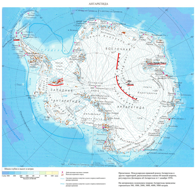 Кроме задач по экстренной эвакуации, автомобили будут нужны для доставки криокапсул вглубь Антарктического континента к месту их постоянного хранения. Хранение криокапсул, в каких-либо холодильных установках не может быть гарантированным на столетия, нет смысла обсуждать все возможные причины отключения холодильных установок, но очевидно, что они не могут работать без перебоев в течение столетий. Все современные фирмы, предлагающие свои услуги в области криобиологии, давая гарантии на столетия, в лучшем случае не оценивают реально свои возможности, в худшем – сознательно обманывают своих клиентов. Поэтому хранить находящихся в анабиозе следует в Антарктиде, желательно, на полюсе холода. Что станет гарантией от каких-либо эксцессов и гарантирует необходимые низкие температуры в течении, как минимум, ближайших тысячелетий, и не потребует никаких дополнительных затрат. Идеальным местом для базы хранения криокапсул может быть высшая точка Советского плато (4004 м.), находящаяся в ~ 500 километрах от полюса относительной недоступности. Эта точка является «истоком», от которого начинают течь все антарктические ледники (см. рис. 11). В этой точке движение ледников минимально, а значит, созданной там базе менее всего грозит появление трещин в толще ледника. База «Исток», при её максимальной пригодности для хранения криокапсул, имеет свои недостатки (или наоборот преимущества), – с какой точки зрения на них смотреть. «Исток» находится на высоте 4004 метра над уровнем моря, при летней температуре -40, а зимней до -90, он предельно труднодоступен для всех видов транспорта, как воздушного, так и наземного. Это хорошо, так как сводит к минимуму вероятность посещения базы «Исток» нежелательными гостями, а плохо потому, что при наличии постоянного персонала, срочная эвакуация, особенно в зимнее время, технически невозможна. Пример такой критической ситуации – пожар на станции «Восток», когда только чудом удалось выжить сотрудникам станции в течение полярной ночи. Ещё одна проблема, которая возникнет при создании базы «Исток» то, что она будет расположена на снежном основании а, следовательно, будет медленно погружаться в снеговой покров. Поэтому она должна состоять из отдельных блоков, которые будут перемещаться по мере их погружения в снеговой покров, а это в свою очередь потребует наличия на базе «Исток» значительного количества техники и обслуживающего персонала. Поэтому, учитывая все сложности создания постоянной базы хранения криокапсул «Исток», её следует считать перспективной, но не первоочередной задачей. В связи с этим возникает необходимость создания промежуточной базы хранения криокапсул, которая бы отвечала следующим требованиям. 1 — она должна находиться в относительно легкодоступном месте для наземного и воздушного транспорта. 2 — она должна располагаться на скальном основании, что гарантирует её нахождение выше снегового покрова. 3 — максимально возможная летняя температура не должна превышать -7 градусов Цельсия (смотри главу «Техническое обеспечение анабиоз» таблица температура давление). По данным многолетних метеорологических наблюдений Российского Государственного научного центра «Арктический и антарктический научно-исследовательский институт» максимально возможная температура на 69°23' южной широты (ста