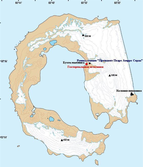 Единственным островом, отвечающим этим условиям, является вулканический остров Десепшн, входящий в группу южных Шетландских островов (см. рис. 12). На острове Десепшн хозяйственная деятельность ведётся с 1820 года когда китобои создали здесь свой посёлок. Представления о извержении вулкана Десепшен как катастрофическом сильно преувеличены с рекламными целями. На самом деле после двух извержений Аргентинская станция «Президент Педро Агирре Серда» находящаяся фактически в самом жерле вулкана не была уничтожена (см. рис. №13).