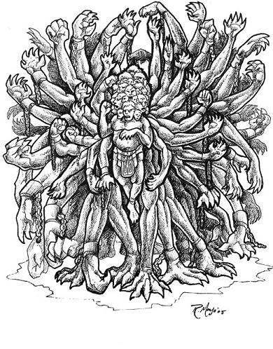 Гекатонхейры — сторукие пятидесятиголовые великаны Бриарей, Котт и Гиес, старшие дети Геи и Урана. Против их ужасной силы ничто не может устоять, сила их не знает предела.