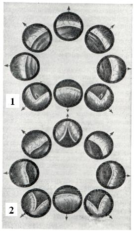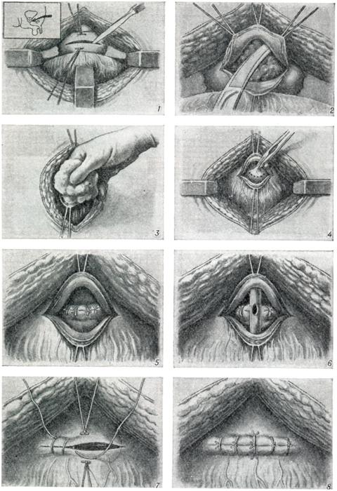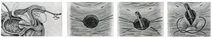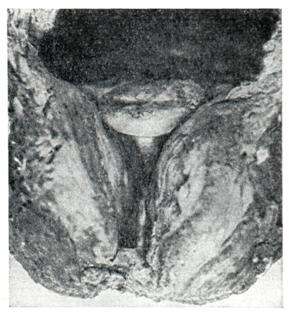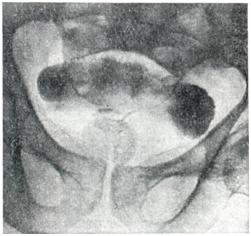 Ректальное пальцевое исследование аденомы предстательной железы проводят в коленно-локтевом положении пациента или в положении на правом боку с согнутыми в коленях и плотно притянутыми к животу бедрами. В последнем случае врач стоит со стороны лица больного и лицом к нему. Исследование следует проводить после мочеиспускания или катетеризации мочевого пузыря. При аденоме предстательной железы размеры долей ее увеличиваются равномерно или асимметрично, срединная бороздка может быть сглажена, верхний край железы при сильном ее увеличении недоступен для пальцевого исследования; консистенция железы бывает мягко-железистой, или плотновато-фиброзной. Если консистенция весьма плотная и очаги уплотнения отличаются хрящевой или деревянистой плотностью, предполагают рак. При аденоме предстательной железы слизистая оболочка прямой кишки над предстательной железой всегда подвижна, при раке (особенно далеко зашедшем) малоподвижна, грубо складчата и может давать ощущение легкой крепитации. Чувствительность предстательной железы при ее аденоме невелика, усиливается при воспалительных изменениях. Рентгенологическое исследование.Применяют экскреторную урографию, цистографию и уретроцистографию; наиболее рациональна лакунарная уретроцистограмма по Кнайзе и Шоберу (рис. 4). Кислород, введенный по катетеру в количестве 150—200 мл, растягивает мочевой пузырь в виде купола. Введенное вслед за кислородом жидкое контрастное вещество (20% раствор сергозина в количестве 20 мл) располагается в области дна мочевого пузыря, выявляя внутрипузырный рост аденомы предстательной железы. Этим методом определяют ряд типичных рентгенологических симптомов: «берета» (рис. 5), удлинения мочеиспускательного канала (рис. 6), «клинка сабли» (рис. 7), приподнятого дна. Экскреторная урография, помимо определения функции почек, указывает на состояние нижних отрезков мочеточников, которые крючкообразно приподнимаются кверху, давая изображение «рыболовного крючка» (рис. 8). Рентгенологическое исследование выявляет также сопутствующие заболеванию камни и дивертикулы. Эндоскопические методы исследования — цистоскопию, уретроскопию (см.) — следует проводить только при гематурии, подозрении на опухоль мочевого пузыря или для дифференциальной диагностики в неясных случаях. Уретроскопия показана в ранней стадии заболевания и не у пожилых, больных. При цистоскопии выявляются выбухания переходной складки в виде занавески (рис. 9), определяется средняя доля в виде барьера, уточняется наличие камней и сопутствующих заболеваний — цистита, язвы, папилломы. Во II и III стадиях заболевания цистоскопия затруднительна, может быть причиной развития инфекции, возникновения простатита и эпидидимита. Поэтому в последние годы большинство урологов предпочитает проводить цистоскопию в операционной перед операцией.