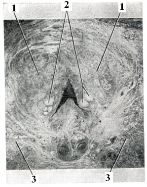 В предстательной железе в практическом отношении принято различать: верхнюю, или переднюю, — краниальную часть и нижнюю, или заднюю,— каудальную часть; с возрастом различие строения этих частей выявляется отчетливее (рис. 1 и 2). Аденома развивается в краниальной части, а рак — в каудальной. Аденома и рак предстательной железы могут сосуществовать у одного и того же больного одновременно. Патологическая анатомия.Предстательная железа при аденоме увеличена; вес ее может достигать 80—100 г и более. Микроскопически выделяют железистую, фиб-розно-мышечную и смешанную формы аденомы предстательной железы. Аденоматозные узлы построены из тесно расположенных ветвистых желез, образующих многочисленные крипты и сосочковые выросты. Железы выстланы 1—2 слоями клеток высокого призматического эпителия. В просвете желез — сгустившийся секрет, амилоидные тельца, скопления лейкоцитов. Строма узлов состоит из зрелой фиброзно-мышечной ткани, бедной клеточными элементами. Встречаются лейкоцитарные и лимфо-гистиоцитарные инфильтраты, абсцессы, очаги некроза. При фиброаденоматозных структурах узлы состоят из редко разбросанных железистых элементов трубчато-альвеолярного строения. Строма узлов богата клетками типа фибробластов. Тубулярная аденома встречается редко. Узлы обычно единичные; они построены из извилистых или выпрямленных трубочек, выстланных одним рядом высоких призматических клеток с бледно окрашивающейся цитоплазмой и базально расположенными ядрами. Ядра гиперхромные без фигур деления. Фиброзно-мышечные узлы, сфероиды, можно видеть почти во всех случаях наряду с узлами железистого строения. Эти узлы, как правило, множественные, редко превышают 1—2 сантиметра в диаметре. Они состоят из богатой клеточными элементами волокнистой ткани, напоминающей строму предстательной железы эмбриона; чаще в них преобладают клетки мышечного типа. В толще таких узлов можно видеть примитивно построенные трубочки, выстланные плоским, кубическим, реже однорядным высоким призматическим эпителием. Клиническая картина.Большинство урологов различает в клиническом течении аденомы предстательной железы три стадии; некоторые — четыре стадии (выделив IV стадию из III): I стадия — предвестников (начальных стертых симптомов), II стадия — гиперемии (период дизурии и дистонии), III стадия — неполной хронической задержки мочи (период остаточной мочи), IV стадия — парадоксальной ишурии (период неполной задержки мочи с растяжением сфинктеров мочевого пузыря). Iстадия (преклиническая) наблюдается чаще у больных в возрасте 50—60 лет, страдавших ранее нарушениями кровообращения мочеполовой системы (на почве перенесенных инфекций). Известно, что более чем у трети мужчин свыше 35 лет в предстательной железе и семенных пузырьках возникают застойные явления и инфекция [Лидер (A. J. Leader)]. В возрасте после 50 лет с развитием аденомы предстательной железы возникают ранние симптомы в виде незначительных нарушений акта мочеиспускания, неприятных ощущений в промежности, внизу живота, в заднем отделе мочеиспускательного канала. Эта ранняя симптоматика объясняется предшествующей аденоме предстательной железы фазой гистиоцитарной инфильтрации в рефлексогенной зоне внутри пузырного треугольника, которая действует как раздражающий фактор. Ранним признаком аденом