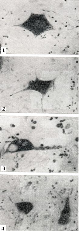 Спинной мозг несколько уменьшен в объеме, мягкая оболочка гиперемирована и утолщена, в корешках и нервных стволах имеются дегенеративные изменения. Отмечается гибель клеток передних и боковых рогов спинного мозга, грудных ядер спинного мозга (столбов Кларка), ядер черепномозговых нервов (в основном двигательных), клеток коры больших полушарий головного мозга, в меньшей степени клеток подкорковых узлов; страдают также грушевидные нервные клетки мозжечка (клетки Пуркинье), зубчатых ядер, олив. Характер процесса дегенеративный, что приводит к грубым изменениям величины и формы сохранившихся клеток (рис. 1).