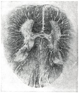 Происходит перерождение пирамидного пучка на всем его протяжении, больше в стволе головного мозга и спинном мозге; в последнем часто страдают передние и задние столбы (рис. 2). Всегда отмечаются воспалительные изменения и периваскулярные инфильтрации, в основном в нижних отделах ствола и спинном мозге (рис. 3). Имеет место пролиферация всех видов глии, особенно микро- и олигодендроглии. В клетках передних рогов спинного мозга людей, погибших от амиотрофического бокового склероза, и экспериментальных обезьян были выявлены цитоплазматические включения (Т. Л. Бунина).