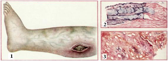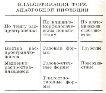 Пользуясь этой классификацией, можно всегда сформулировать динамический диагноз, который в какой-то степени служит и руководством к действию. Например, диагноз «быстро распространяющаяся глубокая форма анаэробной инфекции» явно указывает на необходимость применения быстрых и иногда очень радикальных способов лечения. В США распространена классификация, согласно которой клинические проявления анаэробной инфекции систематизируются следующим образом. I. Травматические раневые инфекции. Простое загрязнение. Анаэробный целлюлит. Анаэробный мионекроз: а) клостридиальный мионекроз; б) стрептококковый мионекроз. II. Нетравматические инфекции. Идиопатические. Инфицированная сосудистая гангрена. Под термином «простое загрязнение» понимается только нахождение клостридиальной флоры в медленно заживающей ране без выраженной общей реакции. К анаэробным целлюлитам относят случаи массивного клостридиального загрязнения раны, когда инфекционный процесс развертывается в нежизнеспособных тканях, не выходя за их пределы, причем здоровые мышцы не поражаются. Анаэробный целлюлит ранее описывался под названием «газовый абсцесс» или «локализованная форма газовой гангрены». Под названием «клостридиальный некроз» или «клостридиальный миозит» понимаются классические клинические проявления анаэробной инфекции с прогрессирующим некрозом и распадом мышечной ткани, с выраженной интоксикацией организма. Стрептококковый мионекроз клинически не отличается от клостридиального и диагностируется только на основании бактериологических исследований. При анаэробном целлюлите в раневом отделяемом находят много лейкоцитов и грамположительных палочек и другую флору; при клостридиальном мионекрозе мало лейкоцитов, присутствуют грамположительные палочки и другая флора; ври стрептококковом мионекрозе в отделяемом много лейкоцитов, отсутствуют грамположительная и другая флора, кроме стрептококков, которые обнаруживаются в большом количестве. Течение анаэробной инфекции может быть молниеносным, быстро прогрессирующим и торпидным. При молниеносном течении уже спустя несколько часов после ранения развиваются грозные явления, приводящие к смерти через 1 — 2 суток; лечение в большинстве случаен оказывается неэффективным. При быстро прогрессирующем течении признаки осложнения появляются не ранее 24 час. после ранения (обычно через 2—3 суток); смерть может последовать через 4—6 дней; этот вид встречается наиболее часто. Торпидное течение характеризуется поздним (не ранее 5—6-го дня) развитием анаэробной инфекции, распространение ее идет медленно и к летальному исходу может приводить через 2—3 недели и позже. При быстро прогрессирующем, а тем более при торпидном течении анаэробной инфекции жизнь раненого может быть спасена своевременными и радикальными лечебными мероприятиями. Наиболее благоприятная форма анаэробной инфекции — позднее образование газового абсцесса, обычно вокруг инородного тела или осколка кости. Диагностика анаэробной инфекции должна быть очень ранней, так как при быстро распространяющихся формах токсемия в короткие сроки приобретает необратимый характер. Для ранней диагностики анаэробной инфекции, особенно при массовом поступлении раненых, нужно еще до снятия повязки и до осмотра раны искать подозрител