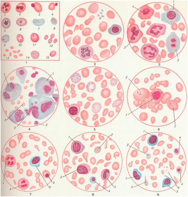 Различные формы эритроцитов крови при анемических состояниях: 1 и 2 — нормобласты в стадии кариорексиса; 3 и 4—энуклеация нормобластов путем выталкивания ядра; 5 — 9 — распад ядра с образованием телец Жолли в базофильно пунктированных эритроцитах (5 и 6) и полихроматофильных эритроцитах (7—9); 10 и 11 — тельца Жолли в ортохромных эритроцитах (после спленэктомии); 12 — хроматиновые пылинки в эритроцитах; 13 — микроциты; 14 — полихроматофильный эритроцит (макроцит); 15 — нормоцит. Рис. 2. Кровь при гиперхромной мегалоцитарной В12(фолиево) дефицитной анемии (анентеральная спруанемия). Анизопойкилоцитоз, гиперхромия, полихроматофилия эритроцитов. Рис. 3. Мегалобластическое кроветворение (стернальный пунктат) при анентеральной спруанемии). Мегалобласты: 1 — полихроматофильный; 2 — в стадии митоза; 3 — оксифильный с «трефовым» ядром; 4 — оксифильный с пикнотическим ядром. Рис. 4. Метастатические раковые клетки (1) в костномозговом пунктате; 2 — нейтрофилы; 3 — эритроциты. Рис. 5. Эритроциты с базофильной пунктацией. Рис. 6. Костный мозг при железо-рефрактерной (сидероахрестической) анемии: 1 грубозернистый кольцевидный сидеробласт; 2 — грубозернистые сидероциты. Рис. 7. Кровь ребенка при простой гипохромной алиментарной анемии: 1 и 3 — сегментоядерный нейтрофил; 2 —большой лимфоцит; 4 — ортохромный нормобласт. Пойкилоцитоз, анизоцитоз, олигохромемия. Рис. 8. Кровь ребенка при анемии Якша — Гайема: 1 — базофильный мегалобласт; 2 — полихроматофильный эритроцит; 3 — нейтрофильный миелоцит; 4 — полихроматофильный нормобласт; 5 — палочкоядерный нейтрофил. Пойкилоцитоз, анизоцитоз, олигохромемия. Рис. 9. Кровь ребенка при анемии на почве чрезмерного употребления козьего молока: 1 — лимфоцит; 2 — полихроматофильный эритроцит; 3 — базофильный нормобласт; 4 — полихроматофильный нормобласт; 5 — полихроматофильный пойкилоцит (эритроцит); 6 — кровяные пластинки. Пойкилоцитоз, анизоцитоз. Важнейшая роль в устранении анемии и восстановлении нормального состава крови принадлежит костному мозгу, его эритропоэтической функции. О состоянии эритропоэтической функции костного мозга судят по морфологической картине стернального пунктата (по методу М. И. Аринкина), в частности по количественному соотношению эритро- и лейко-бластических элементов; в нормальных условиях это соотношение составляет 1 : 3 или 1 : 4. При повышенной регенерации красной крови, когда костный мозг функционирует преимущественно в направлении эритропоэза, соотношение эритро: лейко изменяется в пользу эритробластов, достигая 1 : 1 или 2 : 1 и даже 3:1. В зависимости от преобладания в стернальном пунктате того или иного вида эритробластов различают следующие типы эритропоэза: а) эритробластический, б) пронормобластический, в) нормобластический, г) мегалобластический. Завершающим этапом эритропоэтической функции костного мозга является процесс поступления зрелых, безъядерных эритроцитов из костного мозга в циркулирующую кровь. Эта важнейшая элиминирующая функция костного мозга выявляется динамическим исследованием основных показателей красной крови — содержания гемоглобина, количества эритроцитов и процента ретикулоцитов. Анемия возникает либо когда убыль эритроцитов в крови (вследствие кровопотери или кроворазрушения) на данном отрезке времени превышает максимальные возможности регенер