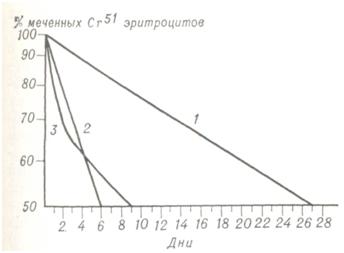 Индикаторные количества препаратов в зависимости от пробы колеблются от 1—5 мккюри Сг51, Со58, Fe59 до 200 мккюри Сг51. Измерительная аппаратура: счетчики сцинтилляционные жидкостные, а также с цельным и колодезным кристаллами, сканеры и гамма-камеры. Показатели нормы для большинства методов имеют относительное значение, так как зависят от деталей применяемых методик. Информативность радиоизотопных методов больше, чем неизотопных. В отличие от ранее распространенного метода дифференциальной агглютинации, при котором определяется продолжительность жизни только донорских (перелитых) эритроцитов, радиоизотопный метод позволяет определить продолжительность жизни и эритроцитов реципиента. В клинической практике единственным методом, позволяющим определить массу депонированных эритроцитов, является изотопный метод. Радиоизотопный метод более чувствителен, чем неизотопные методы выявления желудочно-кишечныъ кровотечений. Он дает возможность количественно определить величину кровопотери на протяжении достаточно долгого времени, что важно в оценке кровопотери как фактора, вызывающего постгеморрагическую анемию (смотри Желудочно-кишечное кровотечение, радиоизотопная диагностика). Особенно целесообразно применение радиоизотопных тестов при затруднениях в диагностике таких анемий, как железо- и В12-дефицитные, железорефрактерные, Маркиафавы — Микели (рис. 1), апластическая. Диагноз аталассемии можно поставить только с помощью радиоизотопного метода. На рис. 2 показано, что в норме включение С14-аспарагиновой кислоты в α- и β-цепи глобина почти одинаково. При β-талассемии уменьшено включение С14-аспарагиновой кислоты в β-цепи, при α-талассемии — в α-цепи. Радиоизотопное определение степени разрушения эритроцитов в селезенке при гемолитической анемии помогает установить показания к спленэктомии. Смотри также Кровь, радиоизотопные исследования, Эритроциты, радиоизотопные исследования. С целью изучения механизма возникновения анемия, процессов регенерации крови, выявления недостаточности кроветворной системы и разработки методов терапии искусственно воспроизводится малокровие у животных. Экспериментальную анемию можно вызвать кровопусканием, разрушением эритроцитов гемолитическими ядами, нарушением целостности различных структурных образований нервной системы, удалением органов и другим. Постгеморрагическую анемию вызывают кровопусканием, котрое делают однократно в количестве 30—40% объема циркулирующей крови (28—35 мл/кг) или повторно 10 — 15 раз по 10—12%; у кошек можно удалить 40—50% объема крови, у крыс и кроликов — не более 30%. Потеря 60—70% крови смертельна. Массивное кровопускание вызывает у собак торможение функции коры больших полушарий в течение 7 — 8 дней, изменение сосудистых и дыхательных рефлексов, понижение артериального давления, гипоксемию и кислородное голодание. Объем крови уменьшается лишь в самом начале кровопотери, затем восстанавливается за счет жидкости, поступающей из тканей. Снижается гемоглобин, число эритроцитов, содержание белков плазмы. Сыворотка животных в течение 5—7 дней приобретает гемолитические свойства: происходит разрушение части эритроцитов и дальнейшее снижение количества эритроцитов и гемоглобина. Эти изменения тем более выражены, чем массивнее кровопускание. Продукты рас