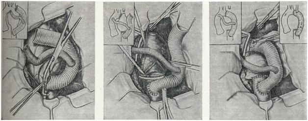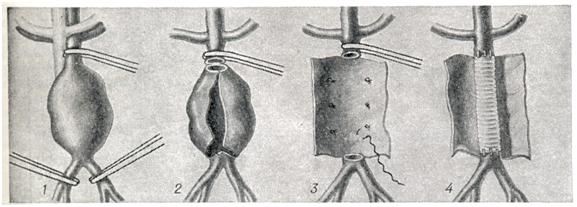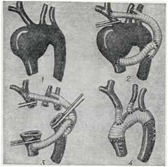 В некоторых случаях аневризма восходящей аорты бывает мешковидной с относительно узкой шейкой. Операция в таких случаях не требует искусственного кровообращения. Накладывают пристеночно зажим на стенку аорты у основания шейки аневризмы (рис. 4—6). Последнюю отсекают, а шейку аневризмы ушивают рядом непрерывных матрацных швов с дополнительным наложением по свободному краю 8-образных швов. В ряде случаев вместо искусственного кровообращения может быть применен временный обходной шунт из пластмассового протеза. Аневризмадуги аорты (рис. 7, 1). Операция требует широкого доступа и обычно выполняется из левосторонней торакотомии с косым пересечением грудины и переходом на правую сторону во II —III межреберье. На фоне искусственного кровообращения между нисходящей аортой и сонными артериями накладывают обходной шунт с помощью пластмассового бифуркационного протеза (рис. 7, 2). Перфузия сосудов головы осуществляется ретроградным путем из нисходящей аорты. В редких случаях возможно перфузировать правую сонную артерию ретроградно через правую подключичную артерию. Далее резецируют аневризму. Дефект дуги аорты замещают протезом. Анастомоз ветвей дуги аорты с этим трансплантатом может быть выполнен как изолированно для каждого сосуда (с «превращением» левой общей сонной и подключичной артерий как бы во вторую безымянную артерию), так и с использованием общего основания для устьев всех трех брахицефальных сосудов (рис. 7, 3). После имплантации в протез ветвей брахицефального ствола выполняют сначала дистальный, а затем и проксимальный анастомозы аорты с протезом, а временный аорто-каротидный обходной шунт-протез удаляют (рис. 7, 4). Больной все это время находится на искусственном кровообращении. Аневризма грудной аорты. При операции требуется защита спинного мозга от ишемии, связанной с пережатием аорты. Применяют различные способы шунтирования крови: с помощью аппарата искусственного кровообращения или пластмассового протеза. Пластмассовый шунт накладывают в обход аневризмы между участками аорты выше и ниже нее, по типу конец в бок. После наложения такого шунта производят иссечение аневризмы аорты. Операция может быть закончена либо замещением дефекта аорты другим протезом по типу конец в конец (тогда ранее наложенный обходной протез снимают, рис. 8—10), либо концы резецированной аорты зашивают наглухо, а временный обходной шунт остается постоянно, приняв на себя кровоток. Травматическая аневризма.При травматических аневризмах аорты и ряде врожденных из-менений нисходящей аорты обычно применяют наложение обходного экстракорпорального шунта из левого предсердия в бедренную артерию, что при травматических аневризмах нередко позволяет восстановить целость аорты без применения трансплантата, так как в этих случаях нет потери тканей. Производится левосторонняя боковая торакотомия в IV межреберье. Выделяют аорту в области левой подключичной и левой общей сонной артерии выше аневризмы, а также участок аорты ниже аневризмы. Сама аневризма на этом этапе выделяется лишь частично. Далее устанавливается обходной шунт (с насосом) из левого предсердия в бедренную артерию. Для защиты спинного мозга от ишемии требуется лишь половина того объемного кровотока по аорте, который имеется в нормальных условиях. Далее пережимают аор