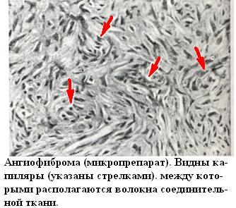 Ангиофиброма кожи имеет форму небольшого, хорошо отграниченного узла, на разрезе охряно-желтого или бурого цвета. Микроскопически характеризуется наличием капилляров с широким просветом, между к-рыми располагаются волокна соединительной ткани (рис.), создающие характерную «муаровую» структуру. Клетки типа фибробластов или фиброцитов располагаются параллельно волокнам. В зависимости от преобладания клеточных элементов ангиофиброма кожи может быть липидной или сидеротической. Липидная ангиофиброма кожи отличается более крупными клетками, в пенистой цитоплазме которых определяется большое количество двоякопреломляющих липидов.