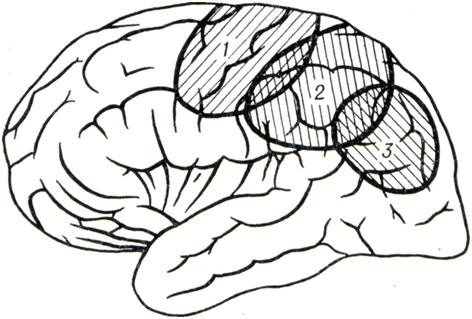 Оральная апраксия представляет особый вид апраксии речевого аппарата, при которой развиваются затруднения моторной речи, принимающие формы афферентной (кинестетической) моторной афазии. Больной не может найти позиций речевого аппарата, нужных для произнесения соответствующих звуков — артикулем, и формируется синдром, в который входит смешение близких по артикуляцтги звуков в экспрессивной речи, своеобразные нарушения письма и тому подобное. Поражение при оральной апраксии локализуется в нижних участках постцентральных (кинестетических) отделов коры доминантного полушария (левого у правшей). Пространственная апраксия проявляется нарушением ориентировки больного в пространственных направлениях, прежде всего в направлении правое — левое. Больной не может нарисовать изображение, ориентированное в пространстве, не может попасть в нужную точку пространства, а также построить фигуру из спичек или сконструировать какую-нибудь пространственную схему (конструктивная апраксия). При письме больной делает пространственные ошибки, будучи не в состоянии правильно соотнести части сложно построенных букв и проявляя признаки зеркального письма, и вся система движений нарушается по выраженному пространственному типу (рис. 2). Описанные нарушения возникают при поражениях теменно-затылочных отделов коры больших полушарий. Кинетическая, или эфферентная, апраксия выражается в том, что нахождение нужных движений и их пространственная организация остаются сохранными, но плавный переход от одного звена сложного движения к следующему оказывается недоступным. Двигательные навыки распадаются, для каждого элемента сложною двигательного навыка требуется специальный импульс, нарушается плавность письма. Подобные нарушения возникают при поражении премоторных отделов коры больших полушарий, преимущественно доминантного полушария (левого у правшей). Как известно из ряда исследований, в частности Фултопа (F. Fulton, 1935), премоторные отделы коры больших полушарий головного мозга находятся в тесной связи с подкорковыми ядрами и принимают непосредственное участие в процессах автоматизации сложных произвольных движений, в формировании плавных двигательных навыков. Эфферентная апраксия характеризуется патологической инертностью движений и двигательными персеверациями (повторением одних и тех же движений), которые больной осознает, но не может произвольно задерживать. Аналогичные дефекты часто проявляются и в письме (рис. 3). При этой форме апраксии поражение располагается в глубоких отделах премоторных областей и приводит к нарушению нормальных связей премоторной зоны с подкорковыми ядрами. Подобная форма апраксии может проявляться в нарушении речевых процессов, что приводит к эфферентной (кинетической) афазии. Больной, без труда находящий нужную артикуляцию, оказывается не в состоянии легко переключиться от одной артикуляции к другой, и произнесение целого слова и тем более целой фразы становится недоступным. Это происходит при поражении нижних отделов премоторной зоны доминантного полушария (левого у правшей) — зона Брока. Лобная апраксия.При лобной апраксии отмечается своеобразный вид нарушения произвольных движений и действий. В этих случаях как кинестетическая и пространственная, так и кинетическая организация дви
