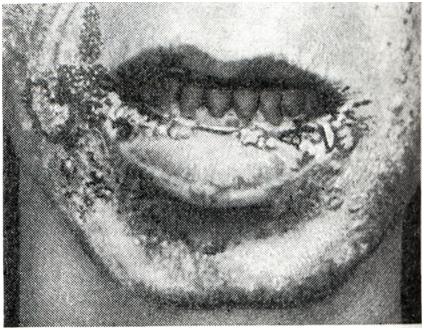 Ранние клинические симптомы — поражения слизистых оболочек рта и кожи. Возникают: ангулярный стоматит — поражение слизисто-кожного соединения в углах рта, характеризующееся побледнением слизистых оболочек, мацерацией эпителия, образованием поперечных трещин, покрытых желтоватыми влажными корочками, покраснением и изъязвлением кожи в углах рта; хейлоз — десквамация эпителия слизистой оболочки в месте смыкания губ, отмечается резкое покраснение красной каймы губ, трещины, расположенные вертикально (рис. 1 и 2), кровянистые корки с последующим рубцеванием; глоссит — поверхность языка вначале зернистая вследствие увеличения грибовидных сосочков, затем сглаженная, язык пурпурного цвета, блестящий. Больные ощущают боль и жжение языка, особенно при приеме пищи. В дальнейшем возникают изменения кожи в виде себорейного дерматита крыльев носа, носо-губных складок, век и ушных раковин с мягким шелушением; ороговение выводных протоков сальных желез («акулья кожа»); сухой зудящий дерматит кистей рук, мошонки, вульвы и заднего прохода. Поу ражение глаз сопровождается конъюнктивитом, нарушением адаптации к темноте, околороговичной инъекцией сосудов, очагами помутнения в роговице, светобоязнью, слезотечением, резью и жжением в глазах, блефароспазмом. Возникают нарушения кроветворения — гипохромная анемия. Наблюдаются нарушения со стороны нервной системы: апатия, головные боли, парестезии, особенно в ногах («жжение ступней»), ретробульбарный неврит, частичная атрофия зрительного нерва; повышение коленного и ахиллова рефлексов, положительный симптом Ромберга, атаксия, клонические судороги. Симптомы со стороны органа зрения и нервной системы встречаются не во всех случаях арибофлавиноза. Их появление и выраженность, повидимому, связаны с длительностью заболевания и степенью трофических нарушений.