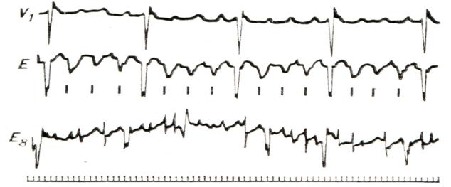 В отведении V1 и большинстве отведений, регистрируемых из полости правого предсердия (Е), регистрируются регулярные волны трепетания (обозначенные вертикальными черточками под отведением Е). Однако на электрокардиограмме, зарегистрированной в одном из участков правого предсердия (Е8), видны беспорядочные зубцы мерцания, имеющие значительно большую частоту, чем волны трепетания. Внизу — отметчик времени (0,01 сек.). Электрическая альтернация сердца. Неравномерность ЭДС сердца в разных комплексах, по-видимому, является результатом повреждения или истощения части мышечных волокон. Встречается при заболеваниях миокарда, интоксикации наперстянкой. Далеко не всегда сочетается с альтернацией пульса. Диагноз устанавливается с помощью электрокардиографии. Отмечается уменьшение амплитуды QRS в каждом четном комплексе, однако расстояние между желудочковыми комплексами одинаково, и каждому из них предшествует нормальный зубец Р. Альтернация пульса — смотри Пульс. Парадоксальный пульс—смотри Пульс.