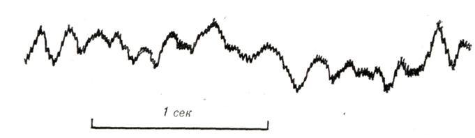Частота импульсации из гетеротопного очага автоматизма выше, чем частота импульсации синусового узла (предсердные зубцы Р обозначены стрелками). Ретроградная проводимость из желудочков в предсердия отсутствует, поэтому большинство желудочковых комплексов не связано с предсердными зубцами Р. Однако если импульс возбуждения случайно достигает желудочков после окончания периода их рефрактерности, в фазу возбудимости, возникает синусовое «захваченное» сокращение (ЗС). Внизу — отметчик времени (0,1 сек.). Аритмии смешанного и неясного генеза.Атрио-вентрикулярная диссоциация — полная или частичная независимость сократительной деятельности желудочков от сокращений предсердий. Наиболее частая причина — это постоянная или транзиторная полная поперечная блокада (смотри Блокада сердца). Неполная атрио-вентрикулярная диссоциация связана с понижением активности синусового узла и повышением активности очагов импульсации низшего порядка, когда частота импульсации в двух источниках автоматизма становится почти одинаковой (изоритмическая диссоциация, рис. 6). Она возникает также, если ритм гетеротопного очага автоматизма чаще, чем ритм синусового узла, и отсутствует ретроградная проводимость из желудочков в предсердия (рис. 7). Последнюю форму называют интерферирующей диссоциацией. Различные формы атрио-вентрикулярной диссоциации могут встречаться как у практически здоровых людей (например, выскакивающие узловые сокращения; смотри выше), так и в результате лекарственных воздействий (дигиталис, противоаритмические средства) и многих заболеваний (инфаркт миокарда, миокардиты различной этиологии). Субъективно обычно ничем не проявляются, изредка больные жалуются на ощущение перебоев. Диагноз устанавливают с помощью электрокардиографии. Лечение направлено на борьбу с состоянием, вызвавшим аритмию (заболевание, интоксикация). Синдром преждевременного возбуждения желудочков — смотри Волъффа — Паркинсона — Уайта синдром. Реципрокные ритмы (эхо-ритмы, возвратные, взаимообратные ритмы). Сущность этих аритмий заключается в том, что один и тот же импульс в результате наличия в атрио-вентрикулярном узле патологической ретроградной проводимости (транзиторной или перманентной) возвращается к тому отделу сердца, в котором возник, и вызывает его повторное возбуждение (рис. 8). Патогенез неясен. Предполагают, что патологическая ретроградная проводимость связана с наличием в атрио-вентрикулярном узле двух изолированных проводящих путей, обладающих неодинаковой рефрактерностью. Источником реципрокных ритмов могут быть различные отделы сердца: предсердия, атрио-вентрикулярный узел и желудочки. Диагноз ставится на основании анализа ЭКГ. Для предсердных форм характерно наличие положительного зубца Р, нормальной продолжительности интервала PQ (R), правильной формы желудочкового комплекса и следующего за ним с укороченным интервалом отрицательного второго зубца Р (рис. 9). Наиболее часто встречающаяся атрио-вентрикулярная форма (рис. 10) характеризуется наличием на ЭКГ парных желудочковых комплексов, между которыми расположен деформированный отрицательный зубец Р (так называемые сендвичи), причем расстояние между парными желудочковыми комплексами не превышает 0,5 секунд. Желудочковые формы также имеют вид спаренных желудочк
