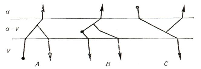 Схематическое изображение распространения возбуждения при разных формах реципрокного ритма. Точкой обозначен источник возбуждения, стрелками — пути его распространения: а — предсердия, a-ν — атрио-вентрикулярное соединение, ν — желудочки. А — желудочковый реципрокный ритм: импульс возбуждения возникает в желудочках, вызывает их сокращение, через атрио-вентрикулярное соединение ретроградно проникает в предсердия, что также приводит к их сокращению, и вместе с тем из атрио-вентрикулярного соединения возвращается в желудочки, вызывая их повторное сокращение. В — узловой реципрокный ритм: возбуждение, возникающее в области атрио-вентрикулярного соединения, быстро достигает желудочков и несколько медленнее — предсердий, причем во время распространения волны возбуждения к предсердиям она расщепляется и часть ее по волокнам пучка Гиса достигает желудочков, вызывая их повторное сокращение. С — предсердный реципрокный ритм: возбуждение возникает в предсердиях и распространяется в желудочки, однако (вероятно, в связи с наличием дополнительных путей ретроградного проведения) возвращается в предсердия, вызывая их повторное сокращение. Внутрипредсердная и межпредсердная диссоциация.Редкая форма аритмии сердца, заключающаяся в независимой деятельности правого и левого предсердия или даже в различных видах ритма на разных участках одного предсердия. Наблюдается, в частности, после пересадки сердца, когда сохранившаяся часть сердца реципиента работает в ином ритме, чем сердце донора. До последнего времени существование такой аритмии подвергалось сомнению. Однако использование внутриполостных и внутрипищеводных отведений ЭКГ подтвердило возможность таких нарушений ритма (рис. 12). Поставить диагноз по данным обычной ЭКГ удается очень редко (разные формы суправентрикулярных аритмий в разных отведениях). Лечение не найдено.