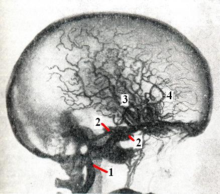 Клиническая картина.Нарушение кровоснабжения мозга проявляется расстройствами психики (раздражительностью, заторможенностью, ослаблением памяти), эндокринными расстройствами гипофизарного происхождения (аменорея, половая слабость). Часто основной является жалоба на сосудистый шум в голове, иногда наблюдается головная боль. Отмечаются слабо выраженные, рассеянные неврологические симптомы, изменения в электроэнцефалограмме. Наиболее типйчны гипертензионные изменения в венах глаза и мягких тканях глазницы на стороне соустья, иногда двусторонние или только на противоположной стороне. При хорошо развитых межкавернозных анастомозах развивается двусторонняя офтальмологическая симптоматика. Отсутствие или недостаточная связь кавернозного синуса с глазничными венами на стороне соустья обусловливает развитие симптомов на стороне, противоположной патологическому очагу. Резко расширенные, переполненные глазные вены выпячивают глазное яблоко, появляется пульсация глаза (пульсирующий экзофтальм), кровоизлияния из вен конъюнктивы, эписклеры и сетчатой оболочки, нередко отек соска зрительного нерва. Разница давления в артериях и венах сетчатой оболочки уменьшается и может доходить до нуля, то есть кровоток к ней прекращается. Наступает ухудшение зрения, иногда до полной утраты его, чему может способствовать также сдавление зрительного нерва расширенным кавернозным синусом. Венозная гипертензия служит основной причиной глаукомы. Нередок хемоз (отек конъюнктивы). Сдавление глазодвигательных нервов и I—II ветвей тройничного нерва обусловливает соответствующие двигательные и чувствительные расстройства. Изредка каротидно-кавернозное соустье не сопровождается пульсирующим экзофтальмом, иногда отсутствует сосудистый шум. Сосудистый шум уменьшается или полностью исчезает при пальцевом сдавлении сонной артерии. Аналогичные симптомы могут возникать при артериальной или артерио-венозной аневризме глазничной артерии, при кавернозной ангиоме глазницы, при каротидноюгулярном соустье. Диагноз ставят на основании данных двусторонней каротидной ангиографии и вертебралъной ангиографии, позволяющих выяснить состояние кавернозного синуса, магистральных сосудов мозга и его коллатерального кровоснабжения. Прогноз без хирургического вмешательства неблагоприятный, так как длительное существование соустья инвалидизирует больного, грозит слепотой и разрывом стенки истонченного кавернозного синуса с кровоизлиянием в полость черепа. Лечение только оперативное, которое при полном выключении соустья приводит к выздоровлению. Однако могут быть рецидивы. Обязательна предоперационная тренировка коллатералей в системе артериального (виллизиева) круга путем систематического сдавления сонной артерии на шее. Однако и самая настойчивая тренировка не всегда гарантирует успех операции. Перевязка общей сонной артерии при хорошо развитых анастомозах с сосудами другой стороны малоэффективна, а при недостаточности этих анастомозов опасна, так как создает тяжелую перегрузку артериального круга, грозящую мозговыми осложнениями. Перевязка внутренней сонной артерии стимулирует быстрое развитие анастомозов между наружной сонной и глазной артериями. Перевязка общей, внутренней и наружной сонной артерий в любой комбинац