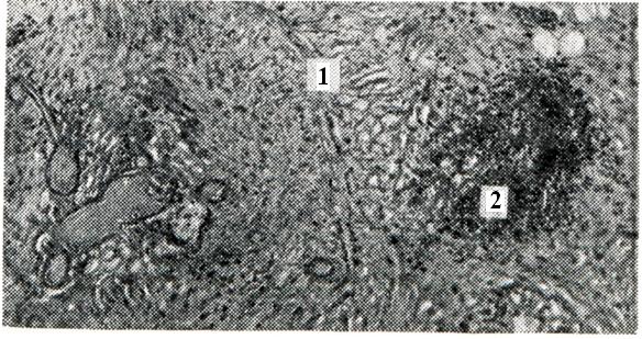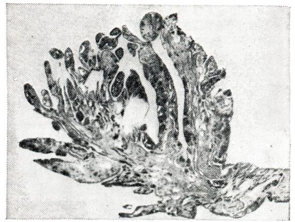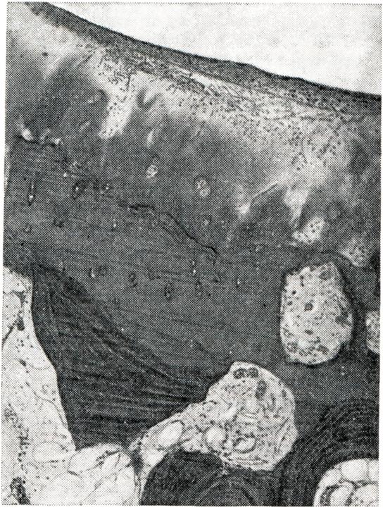 В синовиальной оболочке наряду с гиперемией и отеком микроскопически обнаруживают пролиферацию и десквамацию покровных синовиоцитов, гипертрофию ворсин (рис. 1), пленки фибрина на поверхности, очаги фибриноидного набухания, диффузные инфильтраты, преимущественно из лимфо-гистиоцитарных элементов и единичных плазматических клеток. Наблюдается также разволокнение и фибриноидное набухание стенок мелких артерий и вен не только синовиальной оболочки, но и капсулы сустава и периартикулярных тканей. В воспалительный процесс вовлекаются нервы и чувствительные нервные окончания, что обусловливает резкую болезненность сустава. Суставной хрящ микроскопически не изменен. Может быть остеопороз эпифизарных отделов костей. В подострой фазе отмечается стихание альтеративно-экссудативных явлений, и при микроскопии на первый план выступает пролиферация элементов соединительной ткани. На внутренней поверхности синовиальной оболочки, лишенной покровных синовиоцитов, формируются своеобразные «клеточные подушки», представленные 10—20 слоями фибробластов. По мере созревания соединительной ткани процесс переходит в хроническую фазу. Образуются грубые рубцы, которые приводят к сморщиванию капсулы, связок и параартикулярных образований (сухожилия, фасции, апоневрозы), что значительно ограничивает подвижность суставов. Клеточный состав экссудата в подострой и хронической фазе представлен как нейтрофильными, так и лимфоидными элементами. При микроскопии суставного хряща наблюдается его разволокнение, очаги некроза с образованием дефектов хрящевого покрытия и узурированием кости. Дефекты хряща замещаются грануляционной тканью, наползающей на суставную поверхность в виде различной толщины пленки (паннуса) — паннозный артрит. (рис. 2 и 3). Однако такая последовательность развития изменений хряща не всегда имеет место. Установлено, что при ревматоидном артрите явления дезорганизации основного вещества хряща со снижением содержания кислых мукополисахаридов наблюдаются уже в начальном периоде артрита. Дистрофия хондроцитов развивается постепенно вследствие ухудшения трофики, связанного с уплотнением и распадом основного вещества. Электронномикроскопически в хондроцитах наблюдается редукция митохондрий и эндоплазматического ретикулума, увеличение количества лизосом, По-видимому, и при специфическом артрите. суставной Хрящ в силу лабильности в отношении обменных нарушений повреждается в начале заболевания. При паннозном артрите в субхондральных отделах кости наблюдается перестройка, сопровождающаяся разрастанием эндоста и формированием кист. Отмечается дальнейшее развитие остеопороза. Реже регистрируется уплотнение (эбурнеация) субхондральных отделов; нередко возникают краевые костные разрастания, характерные для деформирующего артроза. Эндостальные разрастания проникают в полость сустава с развитием в ней костной ткани. В исходе хронических форм серозного и серозно-фибринозного артрита могут образовываться фиброзные и костные анкилозы, чему способствует обездвиженность сустава, обусловленная резкой болезненностью. При гнойном воспалении суставов морфологически может быть: 1) гнойный синовит, или эмпиема; 2) флегмона капсулы; 3) гнойный панартртп. В начальных стадиях гнойного синовита экссудат может быт