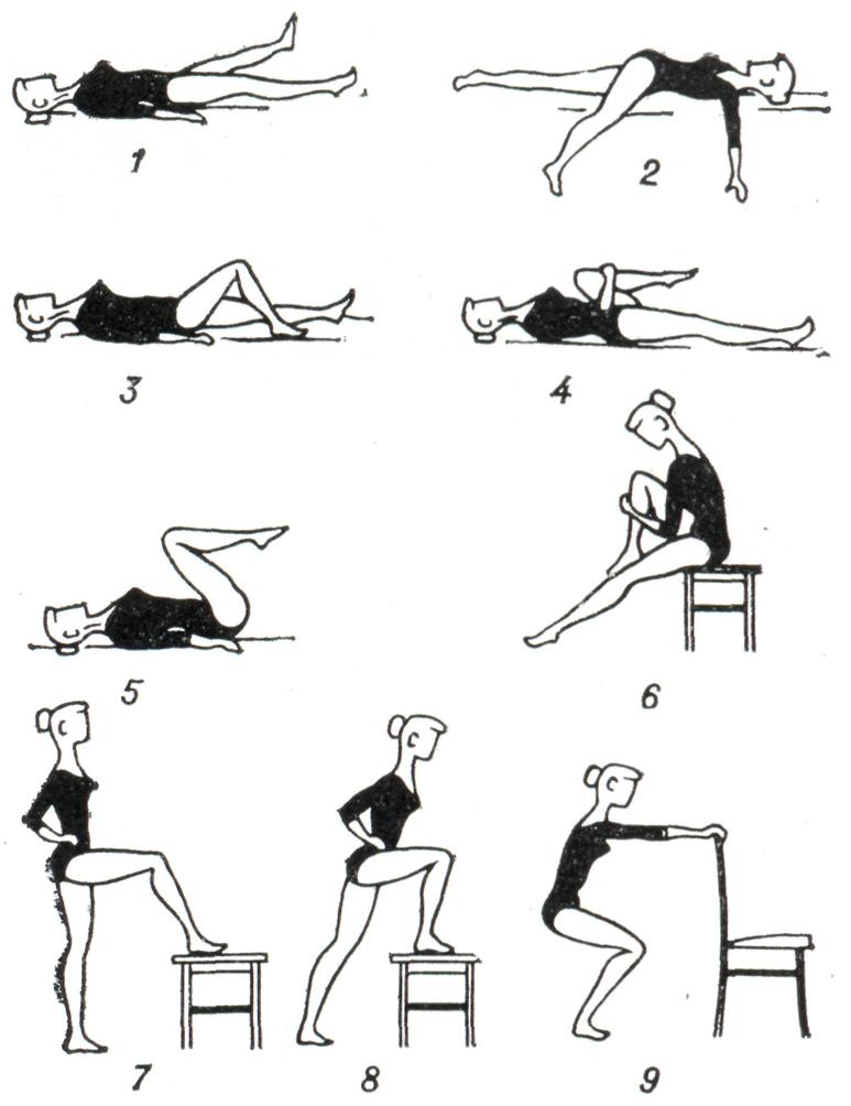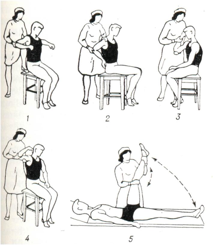 В подостром периоде используют активные, преимущественно облегченные, элементарные упражнения по основным осям движений в суставах в сочетании с общеукрепляющими и дыхательными упражнениями с постепенно возрастающей нагрузкой в положении лежа, а затем сидя и стоя. Наряду с активными упражнениями используют осторожные пассивные движения при возможно более полном расслаблении упражняемой конечности, считаясь с болевыми ощущениями (рис. 10). В терапии хронических артритов лечебная физкультура занимает важное место в клинической, в поликлинической и санаторно-курортной практике. При поражении суставов верхних конечностей упражнения выполняют преимущественно в положении сидя и стоя (рис. 11). При патологии суставов нижних конечностей в положении лежа, сидя и стоя тренируют опорную функцию ног (рис. 12). При заболеваниях позвоночника рекомендуют также и разгрузочные для позвоночника положения, например на четвереньках (рис. 13). Применяют упражнения активные: свободные, с усилием, с широким использованием различных снарядов, предметов и специальных приспособлений (особенно для восстановления функции кисти, в целях бытовой и трудовой реабилитации и так далее). Дополнительно используют упражнения на механотерапевтических аппаратах. Больным рекомендуется выполнение самостоятельных занятий с повторением заданий в течение дня до 4—6 раз продолжительностью по 5 — 7 мин. в целях тренировки пораженных суставов. Кроме того, полезна утренняя гигиеническая гимнастика, прогулки. Целесообразно лечебную физкультуру проводить в сочетании с массажем, бальнео- и грязелечением.