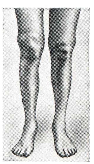 Прогноз благоприятный, но при хроническом рецидивирующем течении могут развиться контрактуры, стойкая деформация и даже фиброзный анкилоз. Лечение: антиревматическая терапия не эффективна. Необходим полный покой, удобное положение сустава, сухое тепло. Хороший эффект дает применение антибиотиков. В тяжелых случаях, кроме обычной десенсибилизирующей терапии, применяются кортикостероиды, при уменьшении активности процесса — ЛФК, массаж, парафиновые, озокеритовые или грязевые аппликации. Паразитарный артритПаразитарный артрит (arthritis pa-rasitaria) может развиться при эхинококковом поражении костей. Эхинококк чаще всего локализуется в позвонках, межпозвонковых дисках, реже в костях таза и длинных трубчатых костях. Суставные боли обычно связаны с реактивным синовитом, вызванным процессом в близлежащей костной ткани. Лечение — смотри Эхннококкоз. Пневмококковый артритПневмококковый артрит наблюдается очень редко, в основном у детей и людей молодого возраста при крупозном воспалении легких. Бактериально-метастатическая форма чаще всего поражает один сустав (коленный, голено-стопный) и протекает как гнойный артрит (в суставном пунктате обнаруживаются пневмококки). При токсико-аллергической форме поражаются многие суставы, но процесс протекает легко, с полной обратимостью всех явлений, специфических лечебных мероприятий не требуется. Лечение гнойных форм — смотри ниже Острый гнойный артрит. Септический артритСептический артрит (arthritis septica) развивается на фоне общего сепсиса, чаще всего вызванного кокковой микрофлорой, кишечной палочкой и другим. В большинстве случаев артрит имеет бактериально-метастатический (острый гнойный артрит), а иногда токсико-аллергический генез. При бактериально-метастатической форме развивается острый гнойный артрит, чаще крупных суставов, с ярко выраженной клинической картиной — смотри ниже Острый гнойный артрит. Токсико-аллергическая форма септического артрита — это острый и подострый мигрирующий полиартрит с небольшим выпотом серозного или серозно-фибринозного характера. Процесс протекает с обратимостью всех явлений. Лечение: антибактериальная терапия сепсиса, противовоспалительные препараты (салицилаты, индометацин), а при необходимости применяют глюкокортикоидные гормоны. Сифилитический артритСифилитический артрит (arthritis syphilitica) может появляться при врожденном и во всех стадиях приобретенного сифилиса. В наст, время встречается редко. При врожденном сифилисе может быть несколько форм артрита: сифилитический остеохондрит Парро, синовит коленных суставов со значительным количеством выпота и шарообразной формой коленных суставов — суставы Клаттона, сифилитический дактилит и другое. Артрит в первой стадии сифилиса может проявляться кратковременной поли-артралгией. Во второй стадии также отмечаются боли в суставах, костях и мышцах, усиливающиеся ночью. Иногда наблюдается полиартрит летучего характера, при котором не помогают салицилаты, но хороший эффект дает лечение пенициллином. В третьей стадии может быть гуммозный артрит крупных суставов, который проявляется гидрартрозом с выпячиванием заворотов синовиальной оболочки (рис. 16). На рентгенограммах могут наблюдаться признаки артроза (вторичный артроз). Если процесс локализован в одном суставе, его внешне трудно отлич