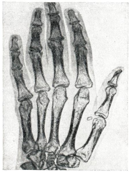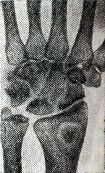 Диагноз ставится на основании клинической картины, серологических и рентгенологических данных (округлые костные дефекты в эпифизах, периоститы). Часто бывает положительной реакция Вассермана с синовиальной жидкостью. Особенно нужно учитывать несоответствие между структурными изменениями и функцией суставов. Большое диагностическое значение имеет обнаружение сифилитических поражений внутренних органов. Прогноз зависит от тяжести течения основного заболевания. Лечение — смотри Сифилис. Туберкулезный артрит, остеоартритТуберкулезный артрит, остеоартрит (arthritis, osteoarthritis tuberculosa) может быть бактериально-метастатическим и токсико-аллергическим. Первая форма обычно представляет собой моноартрит с локализацией в позвоночнике, коленных, тазо-бедренных, локтевых, луче-запястных и других суставах. Туберкулезная палочка в синовиальную оболочку сустава или прилегающую к суставу часть кости попадает обычно гематогенным путем из первичных очагов туберкулеза в легких, кишечнике или лимфатических, узлах. Часто туберкулезный процесс может переходить из прилегающих костей. Поэтому вместо термина «туберкулезный артрит» нередко используется термин «костно-суставной туберкулез». Туберкулезный артрит является хроническим заболеванием, протекающим с признаками общей интоксикации и местными симптомами синовита. При рентгенологическом исследовании в эпифизарной части кости можно обнаружить ограниченный очаг декальцинации (рис. 17), иногда в виде костного дефекта, секвестрацию и сужение суставной щели. Окончательным доказательством туберкулезного процесса в суставе является обнаружение туберкулезных палочек в суставной жидкости или характерных для туберкулеза изменений (туберкулезные бугоргеи) в биопсийном материале синовии. Немаловажное диагностическое значение отводится кожным пробам с туберкулином. Нелеченый или плохо леченный костно-суставной туберкулез может осложняться натечным абсцессом, который прорывается наружу, оставляя затем долго не заживающие и часто вновь открывающиеся свищи (смотри Натечник). Токсико-аллергическая форма туберкулезного артрита, описанная Понсе (A. Poncet) в 1902 г., характеризуется поражением многих, преимущественно мелких суставов конечностей. По клинической картине полиартрит Понсе напоминает ревматоидный артрит, поэтому некоторые авторы оспаривают существование этой формы туберкулезного артрита в качестве самостоятельной нозологической единицы и считают, что в таких случаях речь идет о ревматоидном артрите на фоне туберкулеза