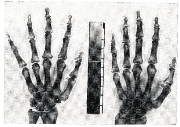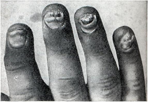 Описанные формы туберкулезного артрита в наст, время встречаются реже, чем артралгии и полиартралгии у больных туберкулезом. Причиной последних необходимо считать как туберкулезную интоксикацию, так и сенсибилизацию организма к лекарственным веществам. Диагноз туберкулезного артрита ставится на основании клинических, рентгенологических и бактериологических данных с учетом кожных аллергических проб. Прогноз и лечение — смотри Туберкулез костей и суставов. Палиндромный ревматизм — смотри статью псориатический полиартрит Псориатический полиартритПсориатический полиартрит (polyarthritis psoriatica) развивается чаще у больных, уже имеющих кожные проявления псориаза, в среднем через 6 лет после их появления, но иногда может им предшествовать или появиться одновременно. Псориатический полиартрит в наст, время выделен в самостоятельную нозологическую форму. Клиническая картина его чрезвычайно похожа на ревматоидный артрит, однако имеет некоторые особенности: 1. Почти всегда поражаются дистальные межфаланговые суставы пальцев рук. Одновременно, как правило, поражаются ногти (рис. 18). 2. В процесс вовлекается обычно небольшое количество других периферических суставов (2—3, редко больше), при этом поражение носит асимметричный характер. В тяжелых случаях суставной процесс может быть генерализованным. 3. Поражаются межпозвонковые суставы поясничной области и крестцово-подвздошные суставы, где могут развиваться анкилозы, поэтому псориатический полиартрит нужно дифференцировать с болезнью Бехтерева. 4. Течение обычно ремиттирующее, резкие обострения часто чередуются с частичными ремиссиями. При этом отмечается определенный параллелизм с кожными проявлениями псориаза.