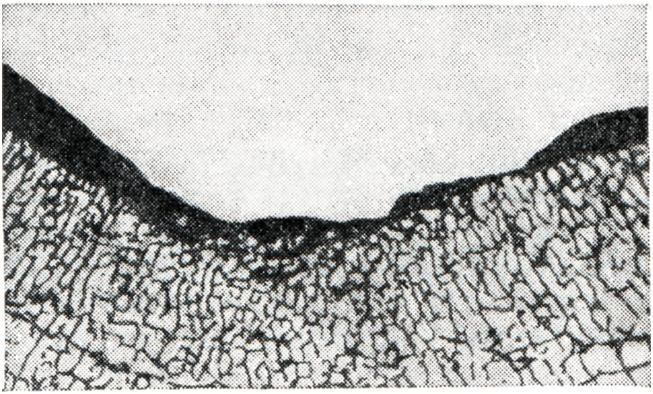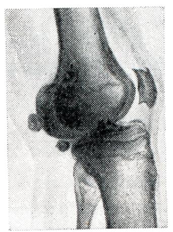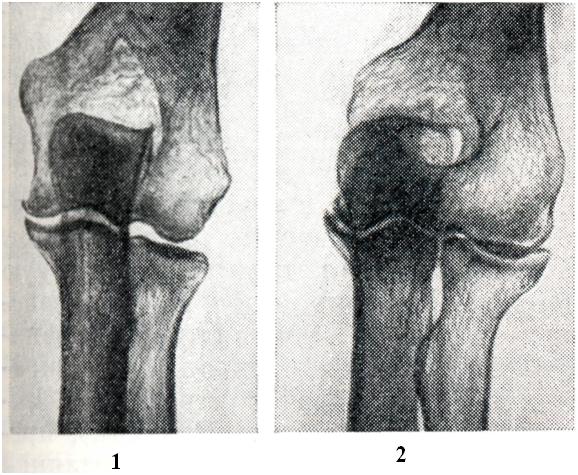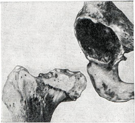 Вторичные артрозы характеризуются развитием изменений в суставных отделах костей на фоне первичного процесса, который рентгенологически может проявляться в виде деформации кости и изменения ее структуры. В результате основного процесса наиболее резко изменяется одна из костей, участвующих в образовании сустава. Остальные кости обычно (при отсутствии воспалительного процесса) страдают значительно меньше. Суставной конец кости деформируется, уплощается и нередко разрушается (рис. 8). Структура губчатого вещества кости подвергается перестройке, что проявляется остеолитическими и остеосклеротическими изменениями. В дальнейшем патологические состояния костей, образующих сустав, заканчиваются развитием вторичного артроза, степень выраженности которого зависит от характера основного процесса. При вторичном артрозе определяется сужение суставной щели, утолщение поверхностей костей за счет краевых костных разрастаний и образование очагов кистозной перестройки.