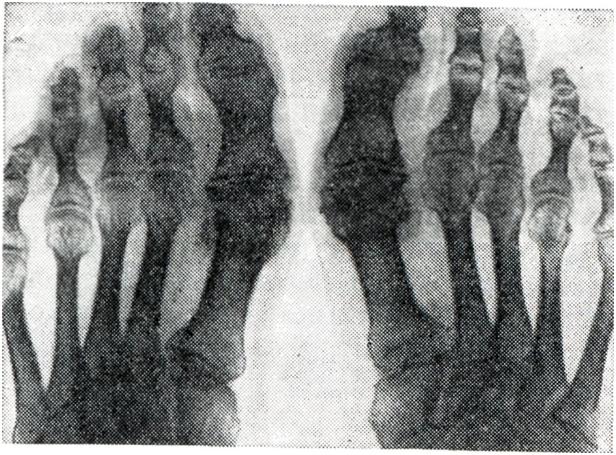 Артроз I плюсне-фалангового сустава является наиболее частым артрозом в области стопы (рис. 16). Он обусловлен вальгусной деформацией большого пальца ноги или длительной его травматизацией. Артрозы могут поражать и другие суставы, напр. височно-челюстные, плечевые, луче-запястные, голено-стопные и реберно-позвоночные сочленения (смотри Спондилоартроз). Все они проявляются сходными клиническими и рентгенологическими симптомами. Полиартрозом называется дистрофическое заболевание многих суставов одновременно. Как правило, это первичная форма заболевания. Развивается обычно в пожилом или старческом возрасте под воздействием эндокринно-метаболических, климактерических расстройств, токсических влияний и других причин. Встречается и в более молодом возрасте. Для полиартроза характерно сочетание поражений суставов конечностей и позвоночника. При этом почти всегда наблюдаются и геберденовские узелки. Диагноз любого артроза ставят на основании клинических, рентгенологических и лабораторных данных. Бессимптомные и латентные формы артроза могут быть диагностированы только путем рентгенографии. В диагностике же клинически выраженных форм используются и другие диагностические критерии. По данным артро-центра Института ревматизма АМН СССР, диагноз деформирующего артроза обычно ставят на основании следующих признаков: 1. Преимущественная локализация процесса в суставах, несущих наибольшую физическую нагрузку. 2. Боль в суставах появляется при движениях и физической нагрузке. Иногда в наиболее выраженных случаях бывают постоянные боли воспалительного характера, что связано с развитием вторичного реактивного синовита. 3. Изменение формы суставов за счет костных разрастаний. Подобные явления обнаруживаются чаще всего в мелких суставах кистей, стоп, в коленных суставах. 4. Ограничение функций суставов обычно умеренное, обусловленное болью или (реже) костными разрастаниями; фиброзных и костных анкилозов никогда не бывает. 5. Отсутствие признаков местного воспаления. Редко имеется умеренный реактивный синовит с выпотом в полость сустава. 6. Отсутствие сдвигов лабораторных показателей, свидетельствующих о наличии воспалительного процесса. 7. Медленное прогрессирование болезни. Анамнез и всестороннее обследование больного помогают определить форму артроза, причину его развития, давность и тяжесть заболевания, сопутствующие болезни и другое. Дифференциальный диагноз проводят с артритами. При артритах боли воспалительного типа, деформация суставов за счет экссудативных и пролиферативных явлений в мягких околосуставных тканях, а не за счет костных разрастаний, движения в суставах ограничены значительно. Сдвиги лабораторных показателей свидетельствуют о наличии воспалительного процесса. Помогают дифференциальной диагностике результаты исследования синовиальной жидкости и морфологического исследования биопсированной синовиальной оболочки. При рентгенологическом исследовании общим для обоих процессов является сужение суставной щели, однако при артритах она суживается больше и неравномерно в разных отделах. При артритах, особенно туберкулезной и ревматоидной природы, вдоль суставной поверхности костей на различных уровнях от нее определяются различной формы и величины очаги деструкции. Кроме того, в начал