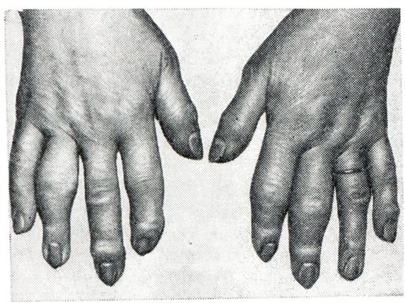 Кроме перечисленных общих клинических и рентгенологических симптомов, артрозы отдельных суставов имеют некоторые дополнительные особенности. Артроз дистальных межфаланговых суставов пальцев рук (геберденовские узелки, геберденоартроз) представляет собой одну из наиболее частых локализаций первичного артроза, обычно поражает женщин, особенно в климактерическом и постклимактерическом периодах. Геберденовские узелки (рис. 9, 10) считаются ранним проявлением первичного генетически обусловленного полиартроза, который одновременно связывают с перегрузкой дистальных межфаланговых суставов мелкой и напряженной работой. Геберденовские узелки развиваются очень медленно, бессимптомно, часто незаметно для самого больного. Лишь в поздние сроки появляются небольшие боли, обычно при смене погоды, небольшая болезненность при пальпации и образуются заметные возвышения по обеим сторонам тыльной поверхности дистальных межфаланговых суставов. На рентгенограмме отмечается сужение суставных щелей, неровность суставных поверхностей, подхрящевой склероз и боковые остеофиты. Артроз проксимальных межфаланговых суставов пальцев рук (бушаровские узелки) встречается значительно реже, чем геберденовские узелки, но по своей клинической и рентгенологической картине от последних почти не отличается. Как правило, бушаровские узелки появляются у лиц, имеющих геберденовские узелки (рис. 9). Это помогает отличить их от ревматоидного артрита, при котором очень часто поражаются проксимальные межфаланговые и пястно-фаланговые суставы раздельно или совместно. Кроме того, деформация сустава при бушаровских узелках обусловлена не утолщением мягких тканей (как при артритах), а твердыми костными разрастаниями. Артроз запястно-пястного сустава I пальца (ризартроз большого пальца) встречается примерно так же часто, как и геберденовские узелки. При этом оба поражения могут быть одновременно. Причиной ризартроза является частая микротравматизация. Клиническая и рентгенологическая картина (рис. 11) — такая же, как и при артрозе двух предшествующих локализаций. Артроз локтевого сустава наблюдается реже в связи с уменьшенной на него нагрузкой. Однако при некоторых видах труда, особенно с виброинструментами, создаются иногда условия для длительной микротравматизации этих суставов и для развития профессионального артроза (у шахтеров, кузнецов, литейщиков, каменщиков и др.), который проявляется резкими болями, усиливающимися после полного сгибания и разгибания в суставе. Вскоре наступает некоторое ограничение его подвижности. Часто отмечается грубый хруст в суставе при движениях. Кроме сужения суставной щели (рис. 12), подхрящевого остеосклероза и краевых остеофитов, часто наблюдаются суставные мыши, представляющие собой либо кусочки оторвавшегося и затем обызвествленного хряща (например, при расслаивающемся остеохондрите), либо проявление суставного хондроматоза. Артроз тазобедренных суставо в (коксартроз) является одной из наиболее частых и тяжелых форм дегенеративных заболеваний суставов. Раннее нарушение функции этих суставов, как уже указывалось, вызвано их особой анатомической структурой. Особенно велик удельный вес вторичных форм коксартрозов, обусловленных врожденными дисплазиями, вывихами и подвывихами бедра, перенесенными з