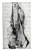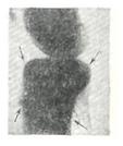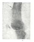 Клиническая картина. Основным клиническим, симптомом заболевания являются боли, которые вначале нерезко выражены, но в последующем усиливаются и приобретают постоянный характер (особенно в ночное время). После полной иммобилизации конечности они, как правило, не прекращаются. В ряде случаев в анамнезе имеются данные о травме. При осмотре пораженного отдела скелета определяется болезненная при пальпации опухоль. Кожа над ней напряжена, горячая на ощупь, с расширенной сетью подкожных вен. Иногда отмечается отек мягких тканей. Часто наблюдается нарушение функции конечности — хромота, ограничение подвижности в находящемся рядом суставе, сгибательная контрактура. В анализах крови отмечают ускоренную РОЭ, увеличение количества лейкоцитов. В поздних стадиях болезни появляется прогрессирующая анемия. По данным В.Я. Шлапоберского, В.Б. Коули и других, нередко отмечается увеличение активности щелочной фосфатазы сыворотки крови. Для остеогенной саркомы характерно гематогенное метастазирование в легкие. По данным Всесоюзного онкологического научного центра АМН СССР, при остеогенной саркоме метастазы выявляют у 75,8% больных. Диагноз практически невозможен без рентгенологического исследования, задачей которого является установление остеогенного происхождения опухоли, характера и протяженности поражения кости, заинтересованности окружающих тканей. Для этого производят рентгенографию кости, в ряде случаев дополняя ее рентгенографией с прямым увеличением и томографией. При рентгенологическом исследовании грудной клетки могут быть выявлены шаровидной формы метастазы остеогенной саркомы в легкие. Рентгенологическая картина остеогенной саркомы многообразна. Содержание в опухоли преимущественно остеоидной ткани и хряща обусловливает картину остеологического поражения. Преобладание процессов опухолевого и реактивного костеобразования создает рентгенологическую картину остеосклеротического варианта остеогенной саркомы. Смешанный вариант остеогенной саркомы проявляется рентгенологически примерно равным сочетанием процессов костеобразования и деструкции. Остеолитический вариант остеогенной саркомы проявляется в виде очага деструкции костной ткани неправильной формы и нечеткими контурами в эпиметафизе длинной трубчатой кости. Разрежение структуры костной ткани вначале может быть столь незначительным, что обнаруживается только на томограммах. При поражении коркового вещества кости оно выглядит неравномерно узурированным изнутри, что создает картину мелкоочаговой деструкции на фоне крупного очага остеолиза. По мере роста опухоли надкостница приподнимается и отслаивается, за счет чего на границе коркового вещества и опухоли возникает периостальный козырек, который формируется у полюсов опухоли, прорастающей за пределы коркового вещества (рис. 3). Этот процесс идет параллельно с процессом разрушения цилиндра кости и замещением костных структур опухолевыми массами, прозрачными для рентгеновских лучей. В связи с этим пораженный метафиз кости выглядит как бы обрубленным. Так как распространение опухоли происходит не только по всему поперечнику кости, но и по длиннику поднадкостнично, то истинная граница опухоли располагается за пределами видимого на снимке дефекта. При остеосклеротическом вариант