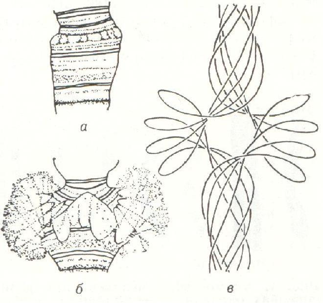 Рисунок №1 Участок политенной хромосомы с дисковой стрктурой(а) и образованием пуфа (б). Схема иллюстрирует возникновение пуфа путем деконденденсации четырех хроматиновых нитей, уложенных в хромомере (в). |