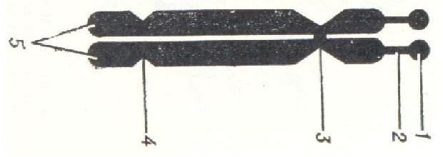 Рисунок №2 Схема хромосомы в метафазе деления клетки: 1 - спутник; 2 - вторичная спутничная перетяжка; 3 - первичная (центромерная) перетяжка; 4 - вторичная несптуничная перетяжка; 5 - сестринские хроматиды. |