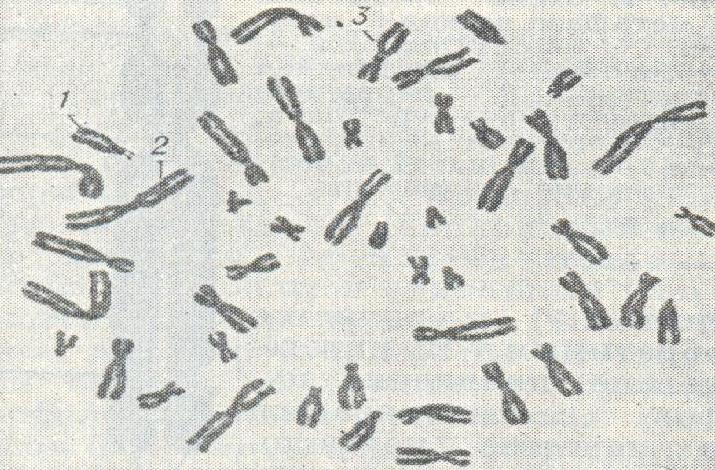 Рисунок №3 Хромосомный набор человека в метафазе деления клетки: 1 - акроцентрическая хромосома со спутником в коротком плече; 2 - метацентрическая хромосома; 3 - субметацентрическая хромосома с вторичной перетяжкой в околоцентромерном районе длинного плеча. |